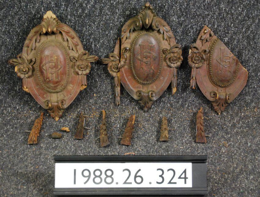 One lot of three cartouche ornaments - one of which is nearly complete but with detached parts. Second is nearly complete but broken. The third has been cut and a significant portion is missing. Carved ornament includes floral motifs and central monogram with "HO" for Hotel Oregon. Made of mahogany. Stained and varnished.