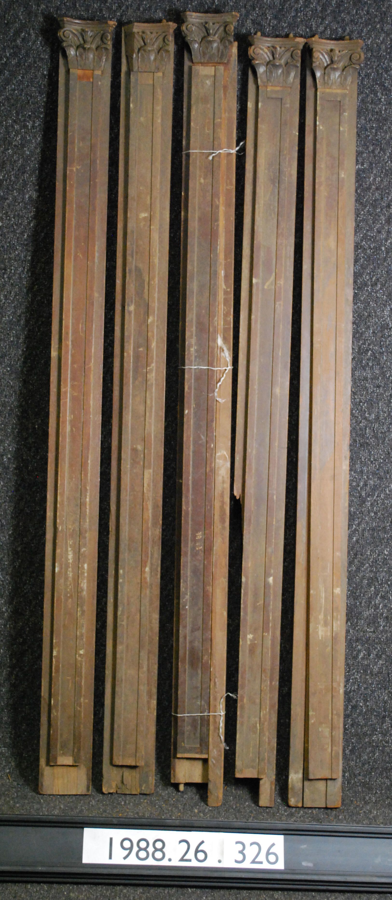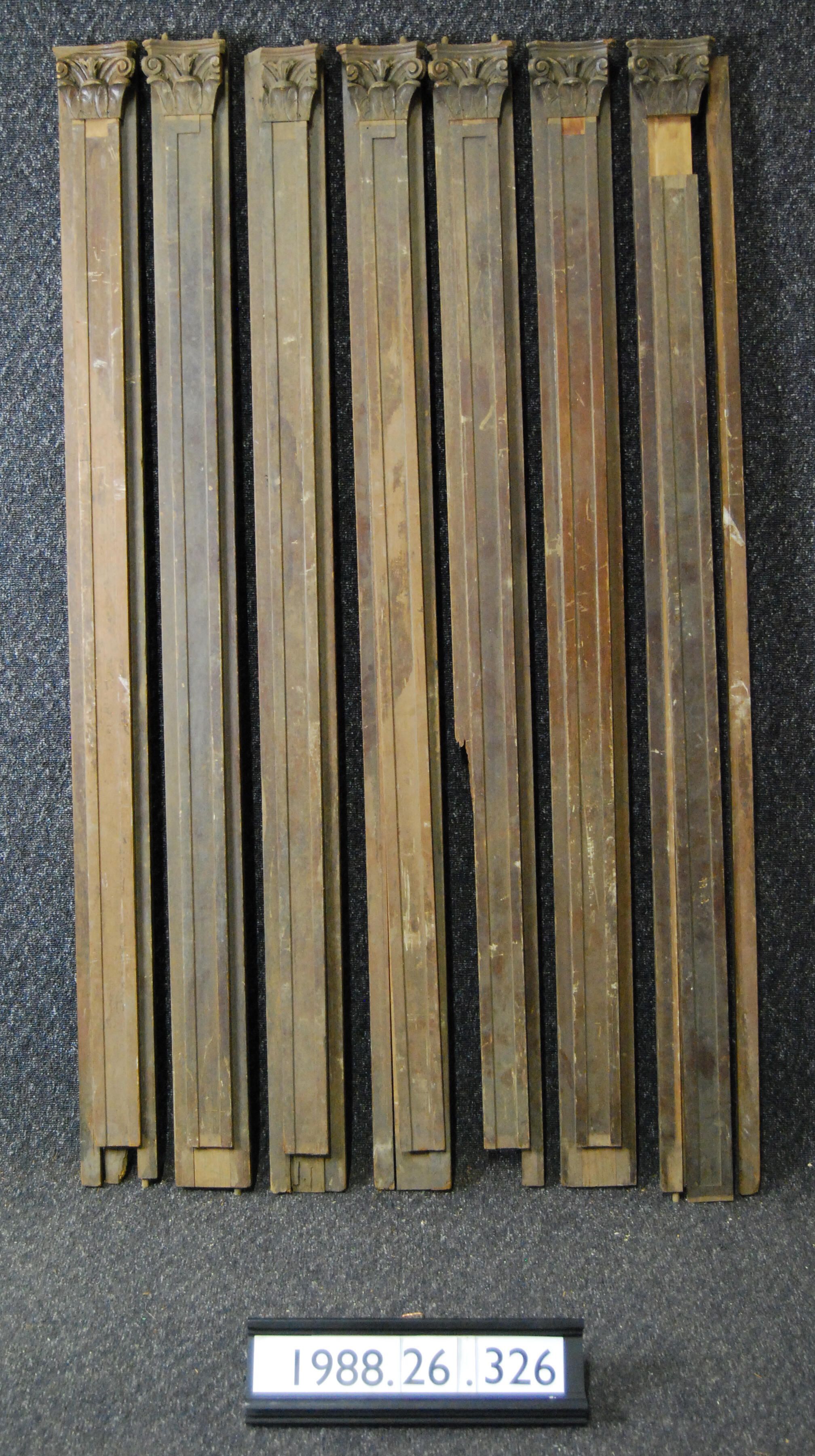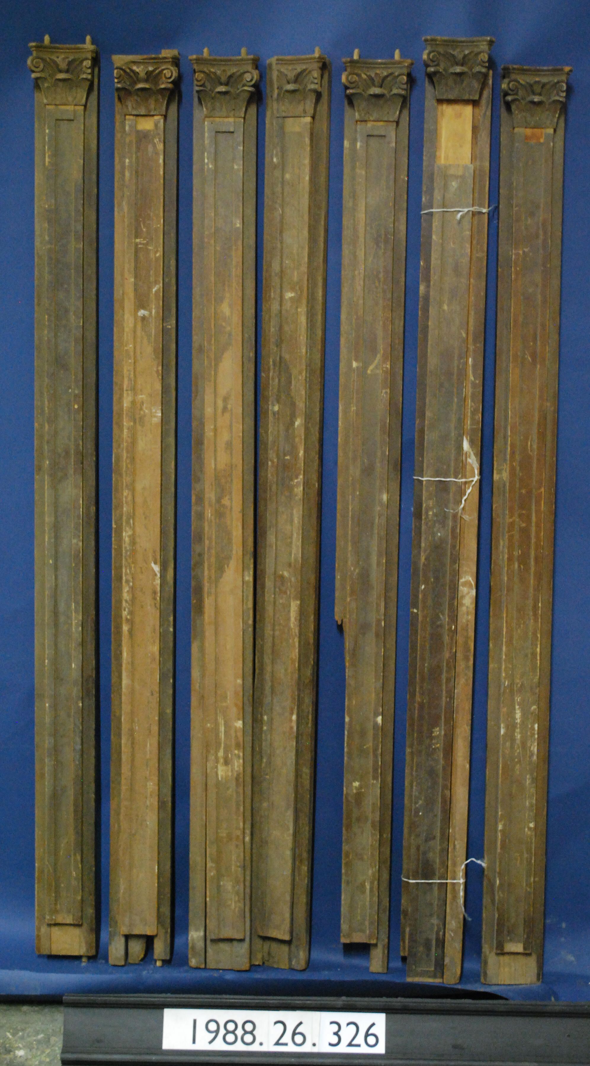 One lot of seven interior wood pilasters. Each has carved capital. Each is built-up from multiple component parts. Some parts are detached. Some parts are missing. Possibly once part of back bar or store fixture? Made of Walnut - secondary wood is Pine. Varnished finish..