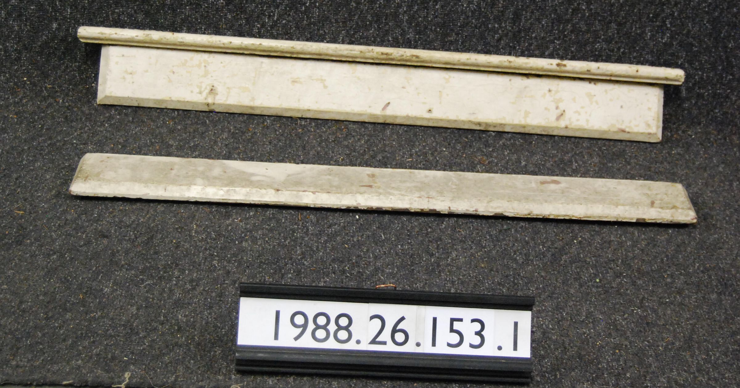 One lot of four interior wood window casing components. Includes two pieces which are beveled on three edges and two window stools. Made of softwood. Painted white.