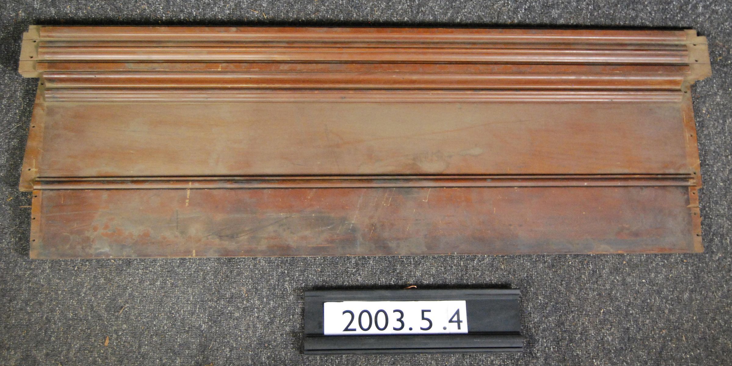 Interior wood panel. Originally part of bench in Inglenook off of master bedroom, second floor. Includes horizontal moldings. Baseboard (detached) made of walnut. Secondary wood backing strips made of pine. Vanished.