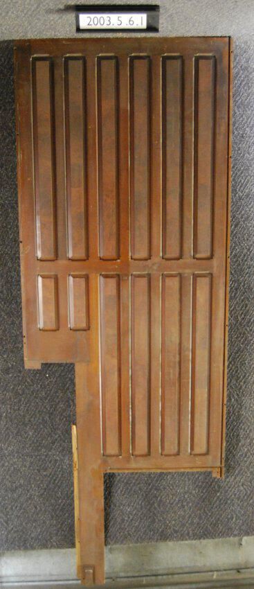 Interior wood panel. Originally part of wall at Inglenook adjacent to fireplace and bench. Has series of inset panels with burl veneer. Made of walnut. Varnished.