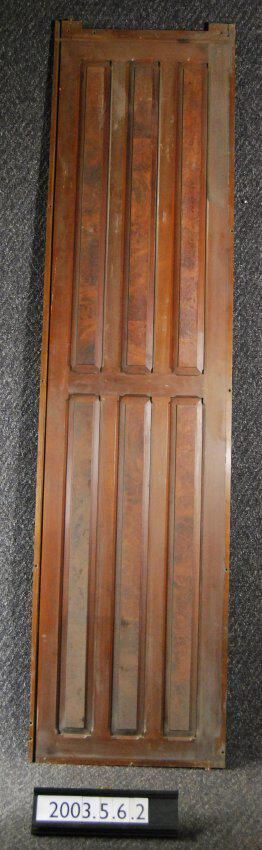 Interior wood panel. Originally part of wall at Inglenook, second floor, adjacent to fireplace and bench. Has series of inset panels with burled veneer. Made of walnut. Varnished.