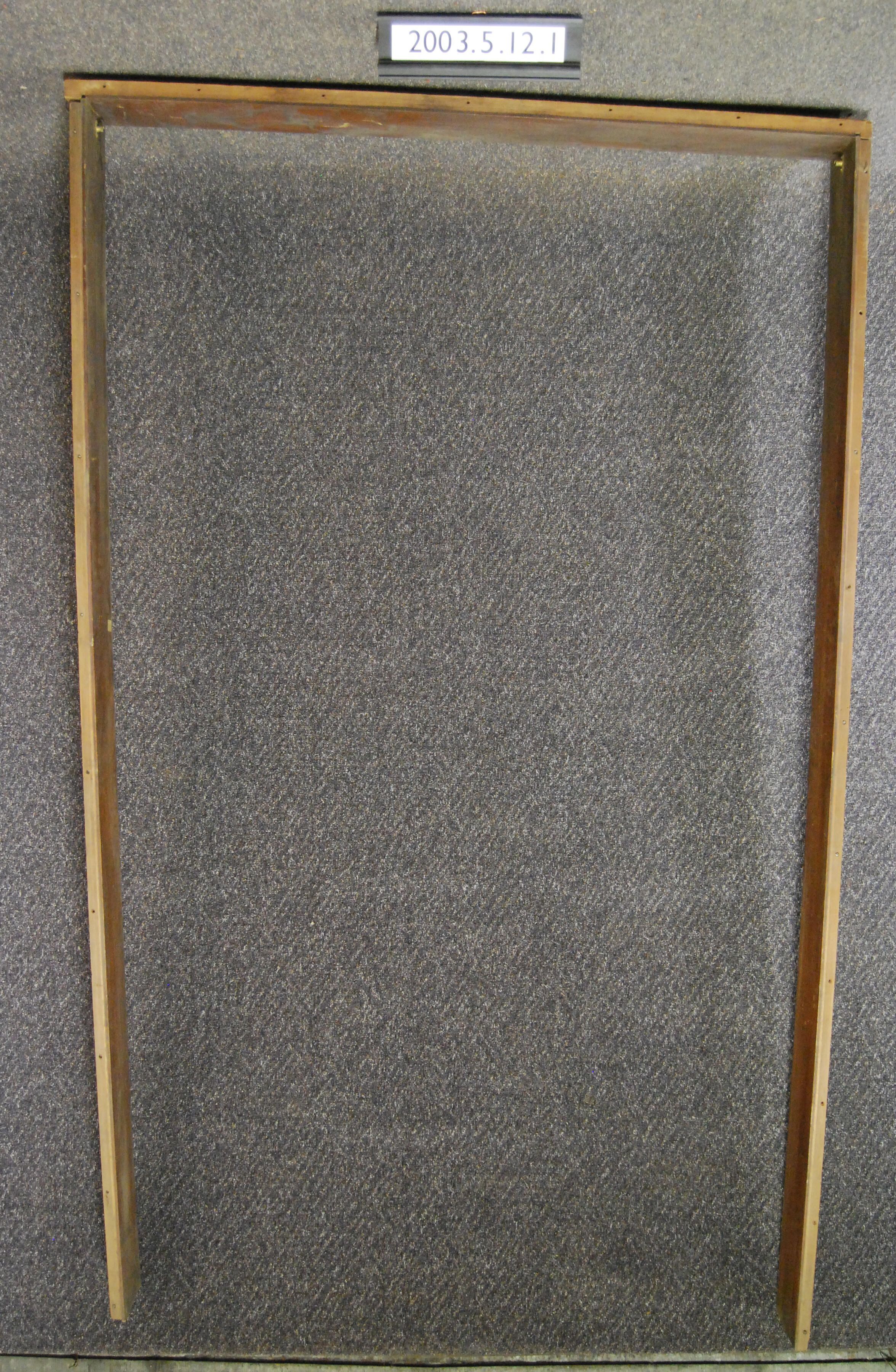 Interior wood. Rectangular frame. Originally fastened to 2003.5.12 doorway casing with wood screws. Composed of three parts: Header and two uprights. Has 2 brass curtain rod holders. Originally served as doorway leading to Inglenook, Second floor, off of master bedroom. Made of walnut, with secondary softwood backing.. Varnished.