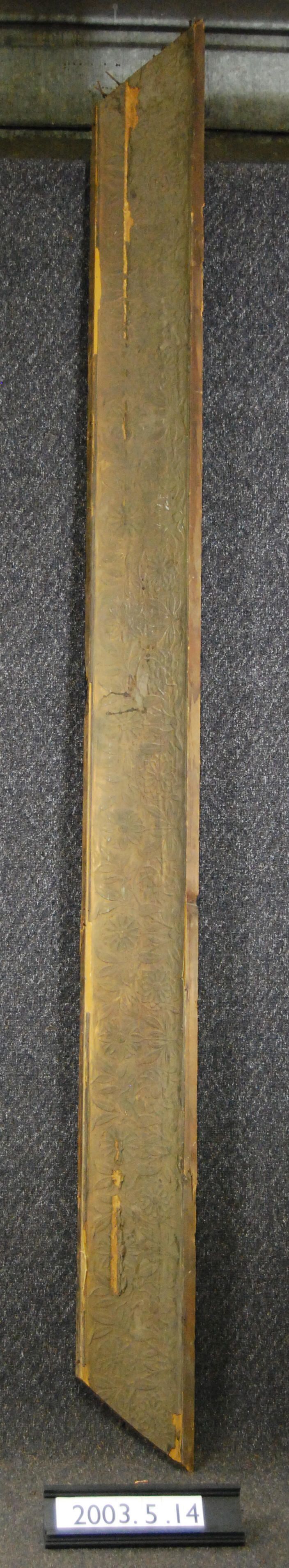 Interior wood crown molding (cove molding near ceiling). Mitred at both ends. Has attached botanical motif Lincrusta wallpaper. Originally had walnut molding attached to one edge. See 2003.5.14.1. Made of softwood.