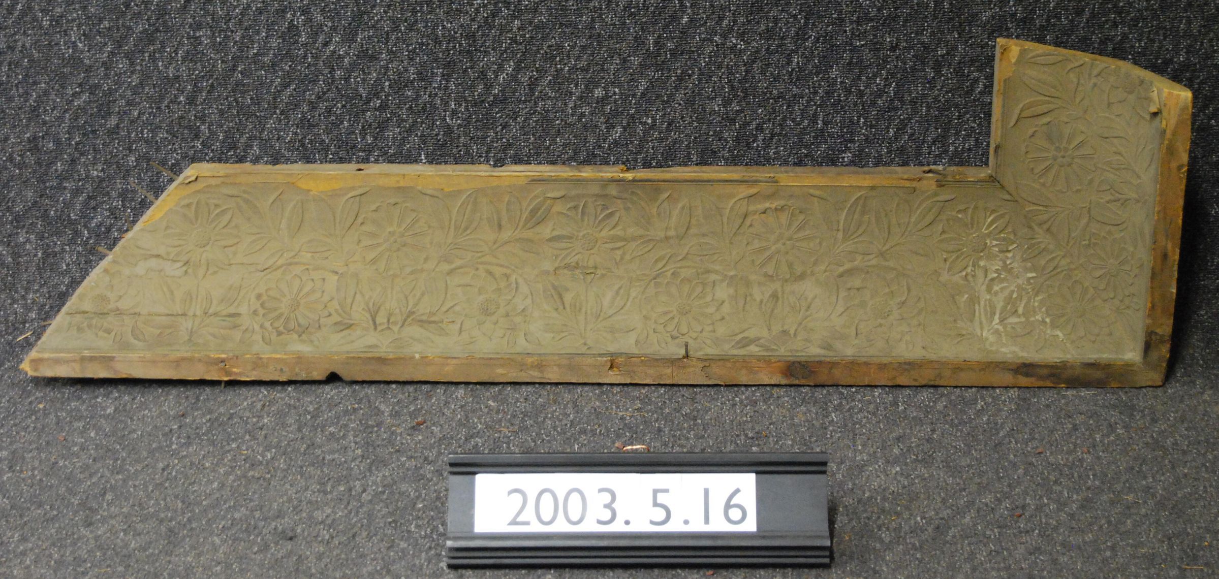 Interior wood crown molding (cove molding near ceiling). with atached Lincrusta wallpaper. Mitred at one end. Opposite end is mitred and has attached right-angle matching cove appendage which is truncated. (Originally joined 2003.5.15).