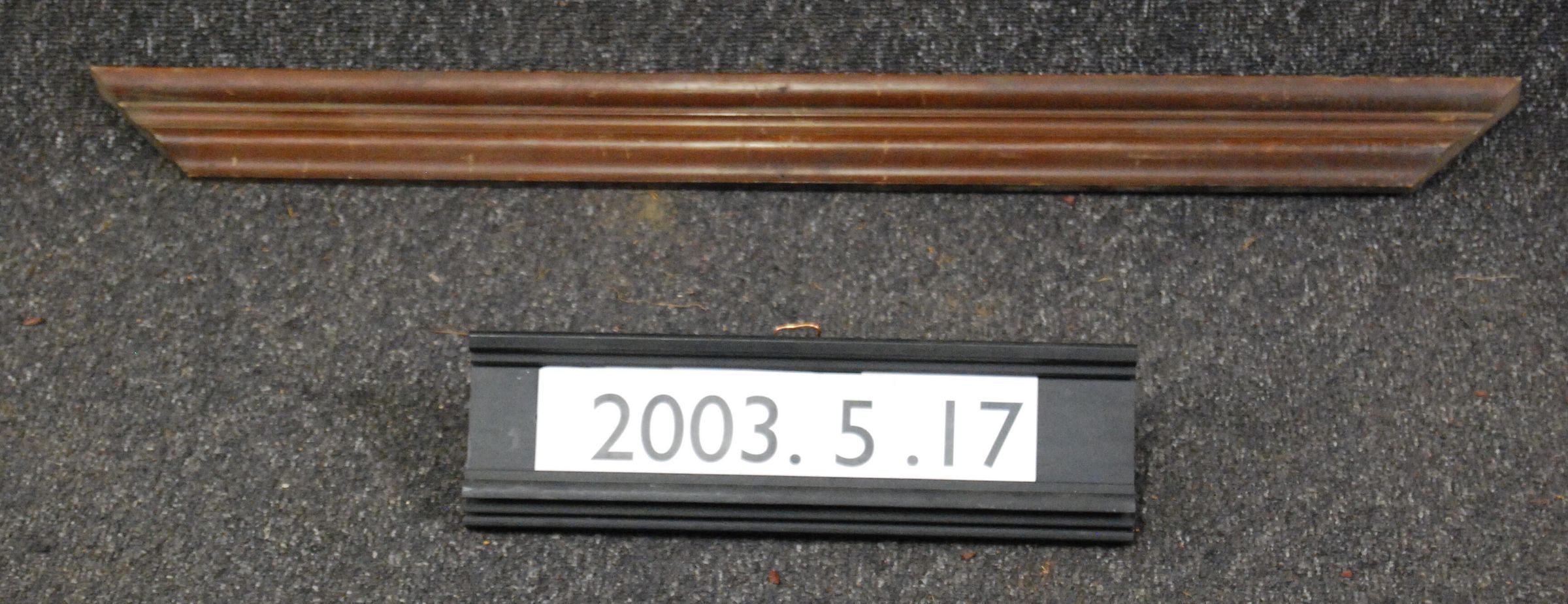 Interior wood molding.Complex, compound profile,mitred at both ends.Originally attached to cove molding at ceiling,inside Inglenook,second floor - off of master bedroom. Made of walnut,varnished.