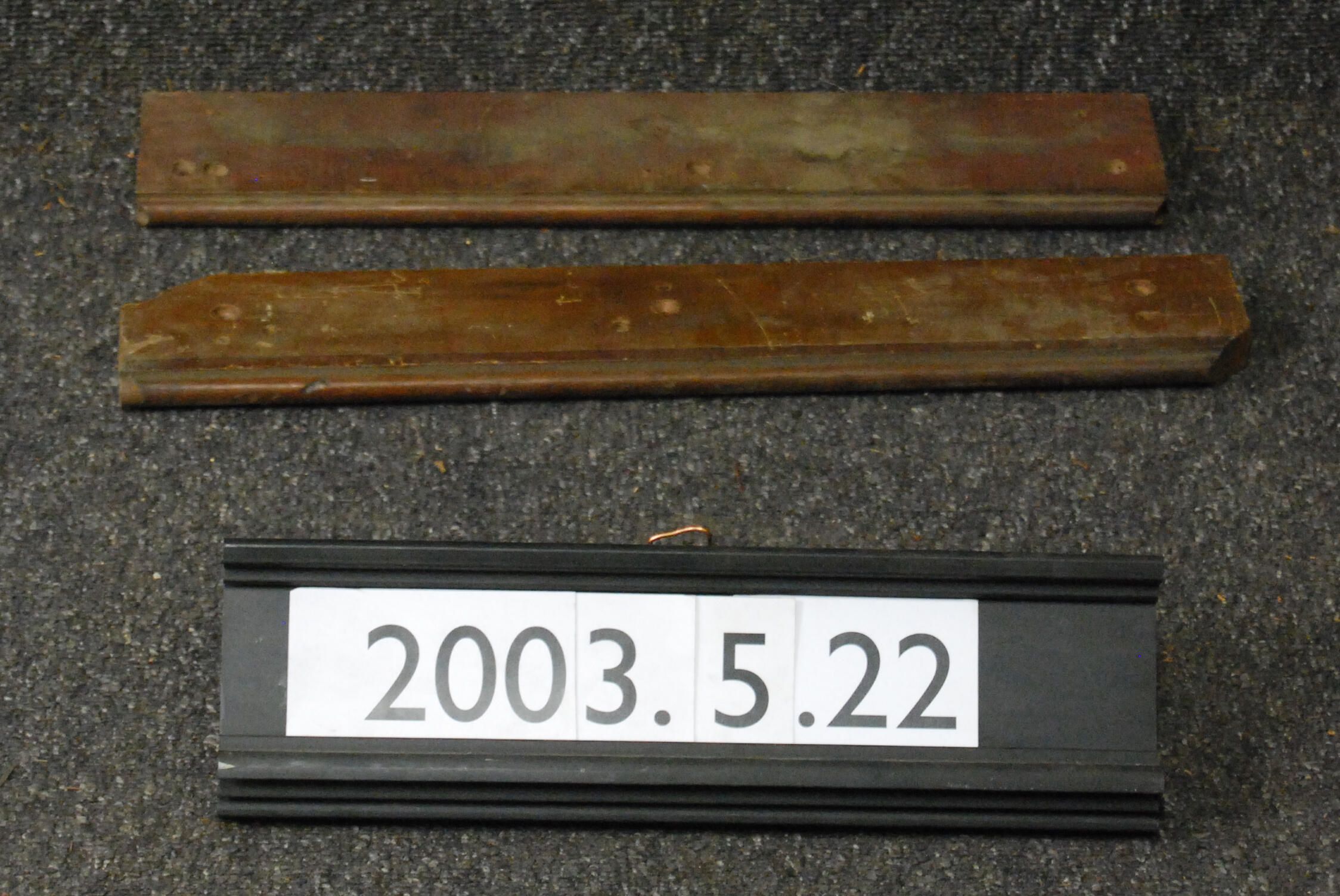 One lot of two interior wood moldings (or boards with convex molded edges). One has coped ends. Other is notched on two opposite corners. Attributed to Knapp House, but original placement undetermined. Possibly associated with benches in Inglenook? Made of walnut. Varnished.