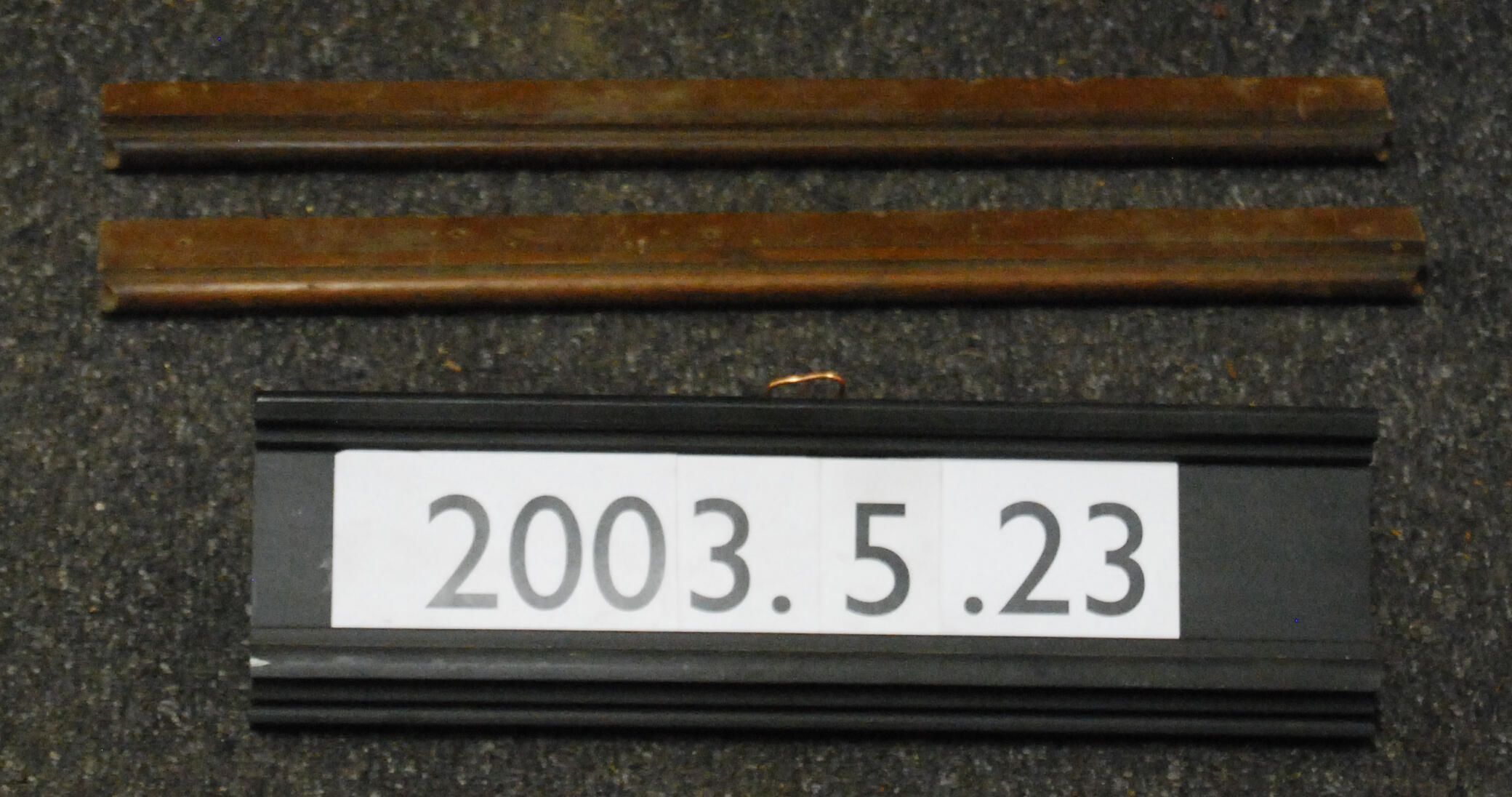 One lot of two interior wood moldings (same molded profile as 2003.4.22). Both have coped ends. Attributed to Knapp House, but original placement undetermined. Possibly associated with benches in Inglenook? Made of walnut. Varnished.