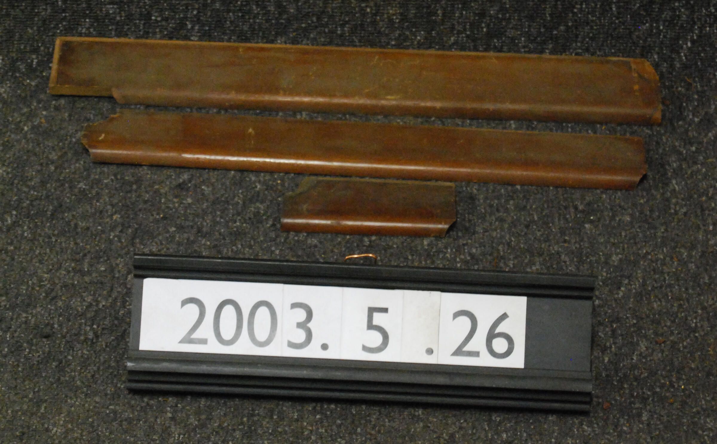 One lot of three interior wood moldings. Plain rounded edge. Attributed to Knapp House, but original placement undetermined. Made of walnut. Varnished.