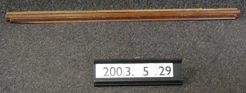 Interior wood molding. Built-up from two molding pieces. Attributed to Knapp House, but original placement undetermined. (One portion has same molding profile as 2003.5.28). Made of walnut. Varnished with softwood backing strip.