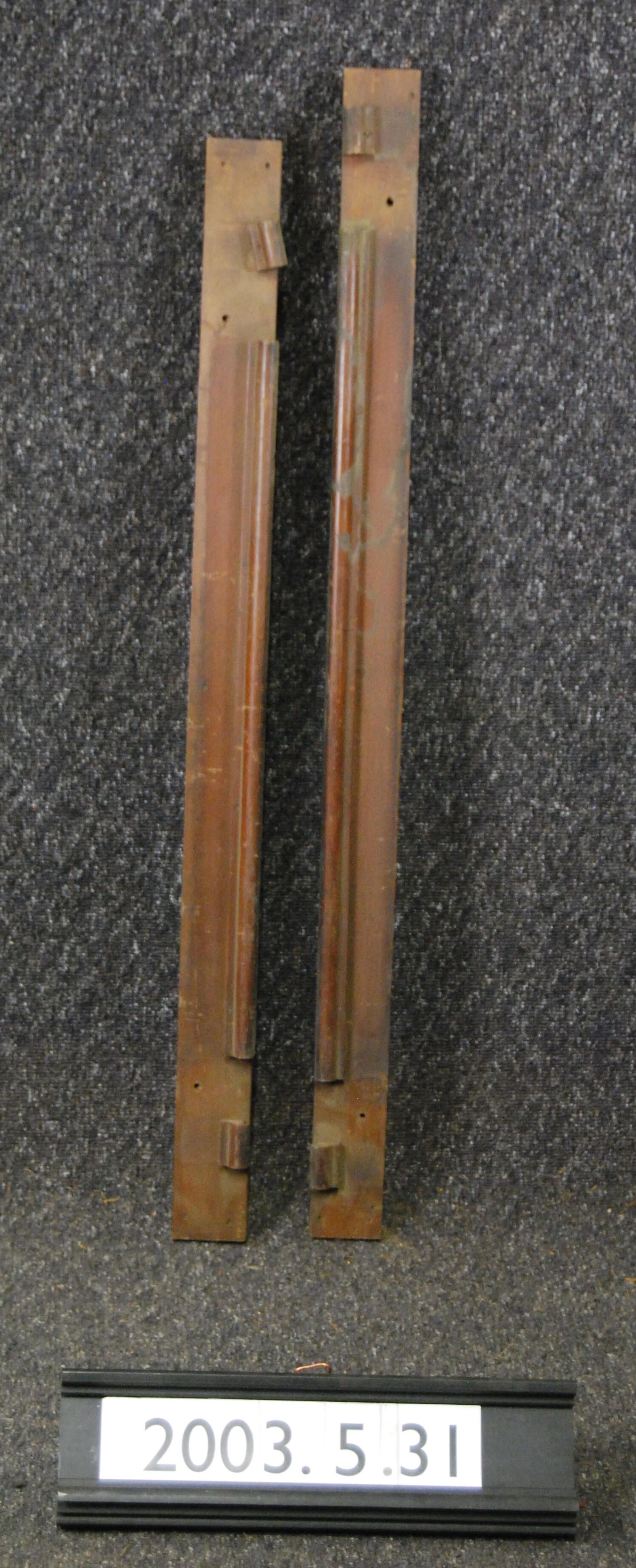 One lot of two interior wood moldings / trim. Rounded profile. Attached to boards (same molding profile as 2003.5.30). Attributed to Knapp House, but original placement undetermined. Made of walnut. Varnished.
