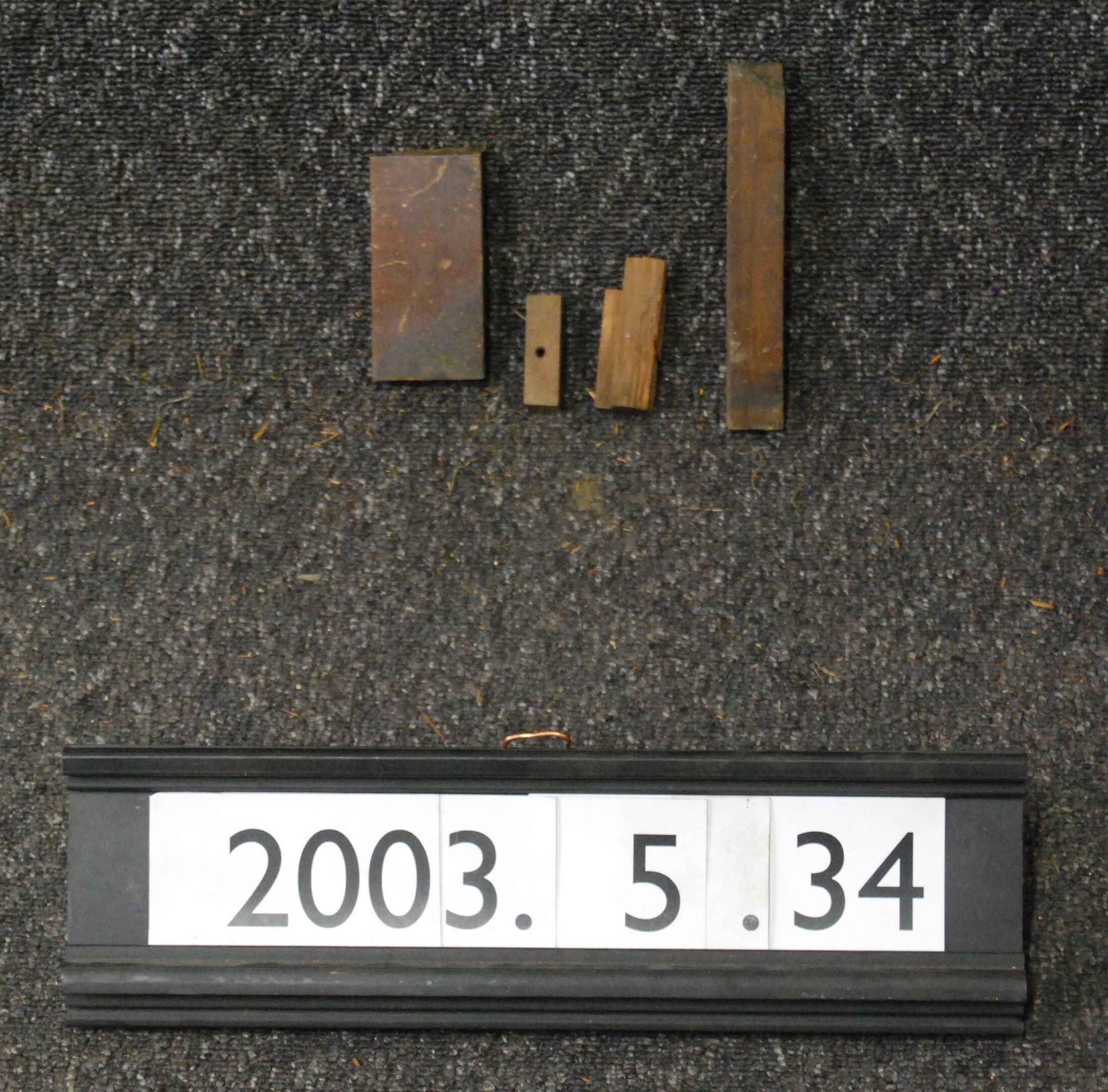 One lot of four interior wood small pieces of trim or trim fragments. Attributed to Knapp House but original placement undetermined. Made of walnut. Three pieces varnished - one unfinished.