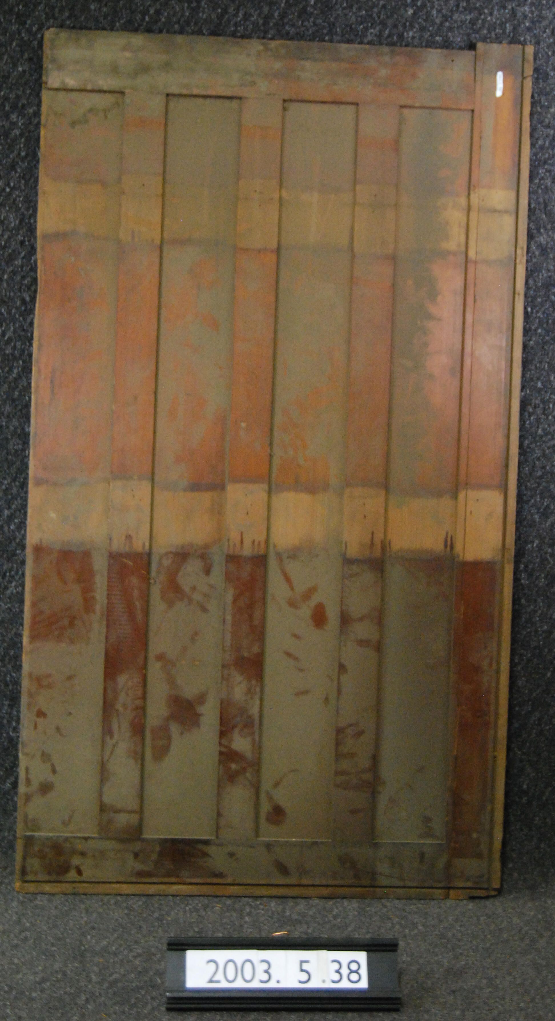 Interior wood panel. Series of vertical stiles joined with mortice and tenons to horizontal rails. One stile is missing, one is truncated. Found in collection stored with Knapp house parts, but provenance not determined. Appears to be back panel from furniture? Made of softwood. One side is varnished.