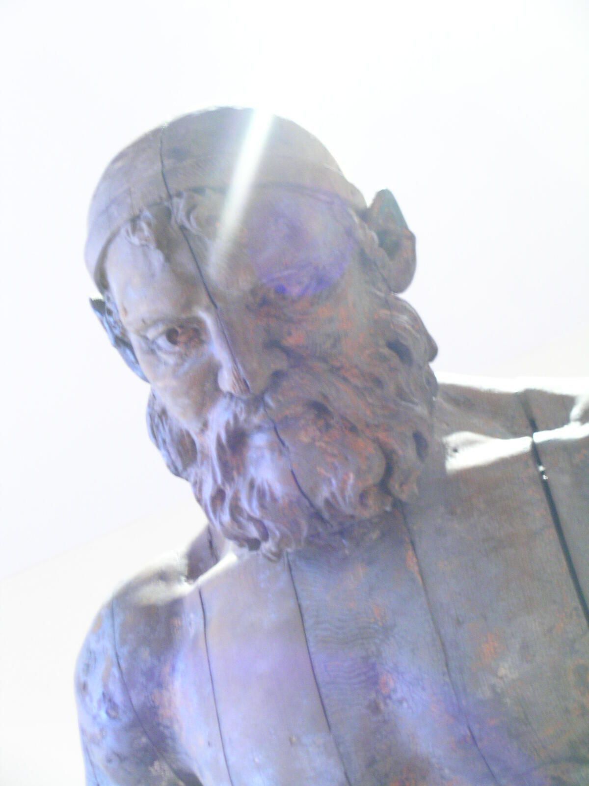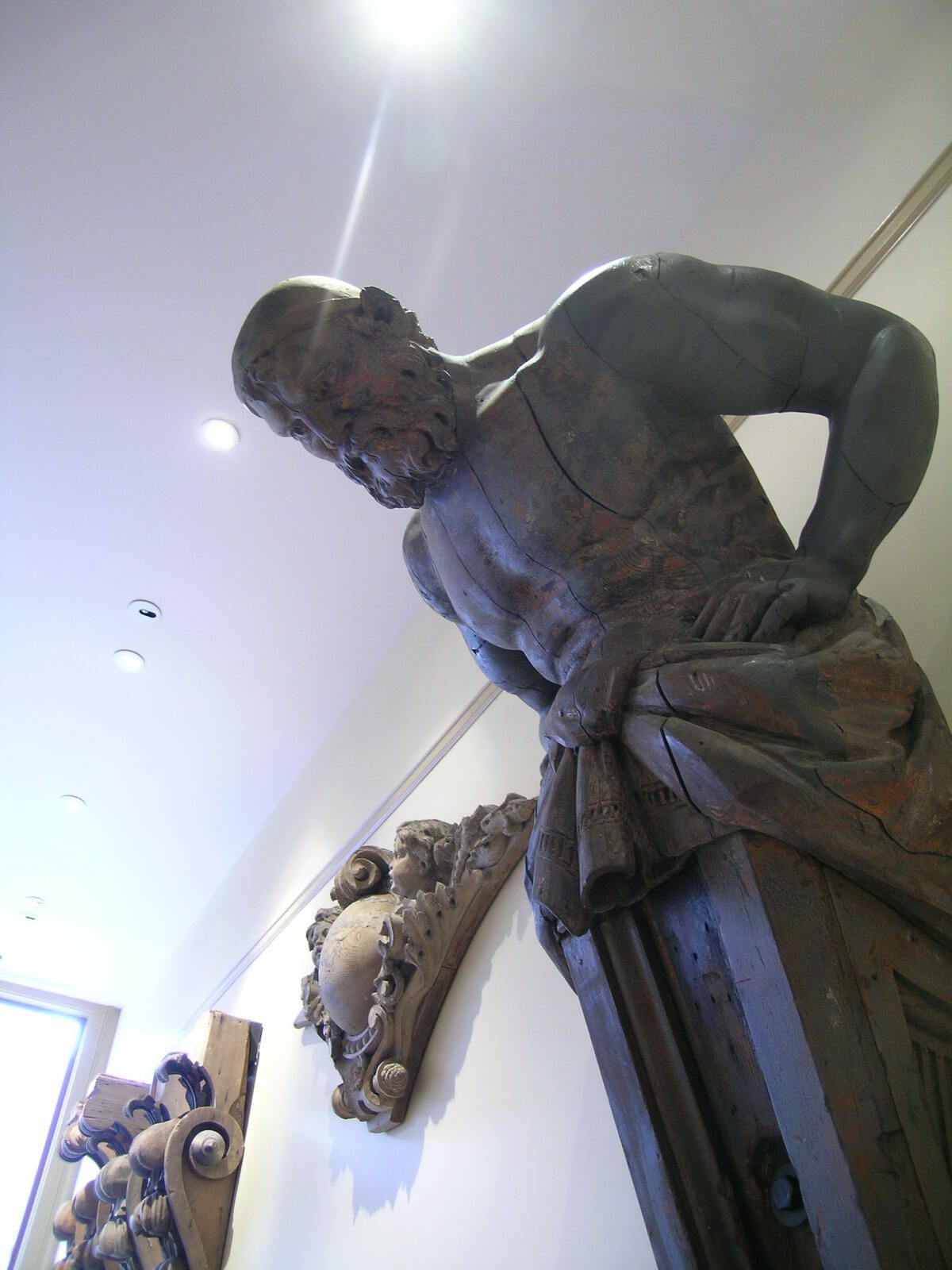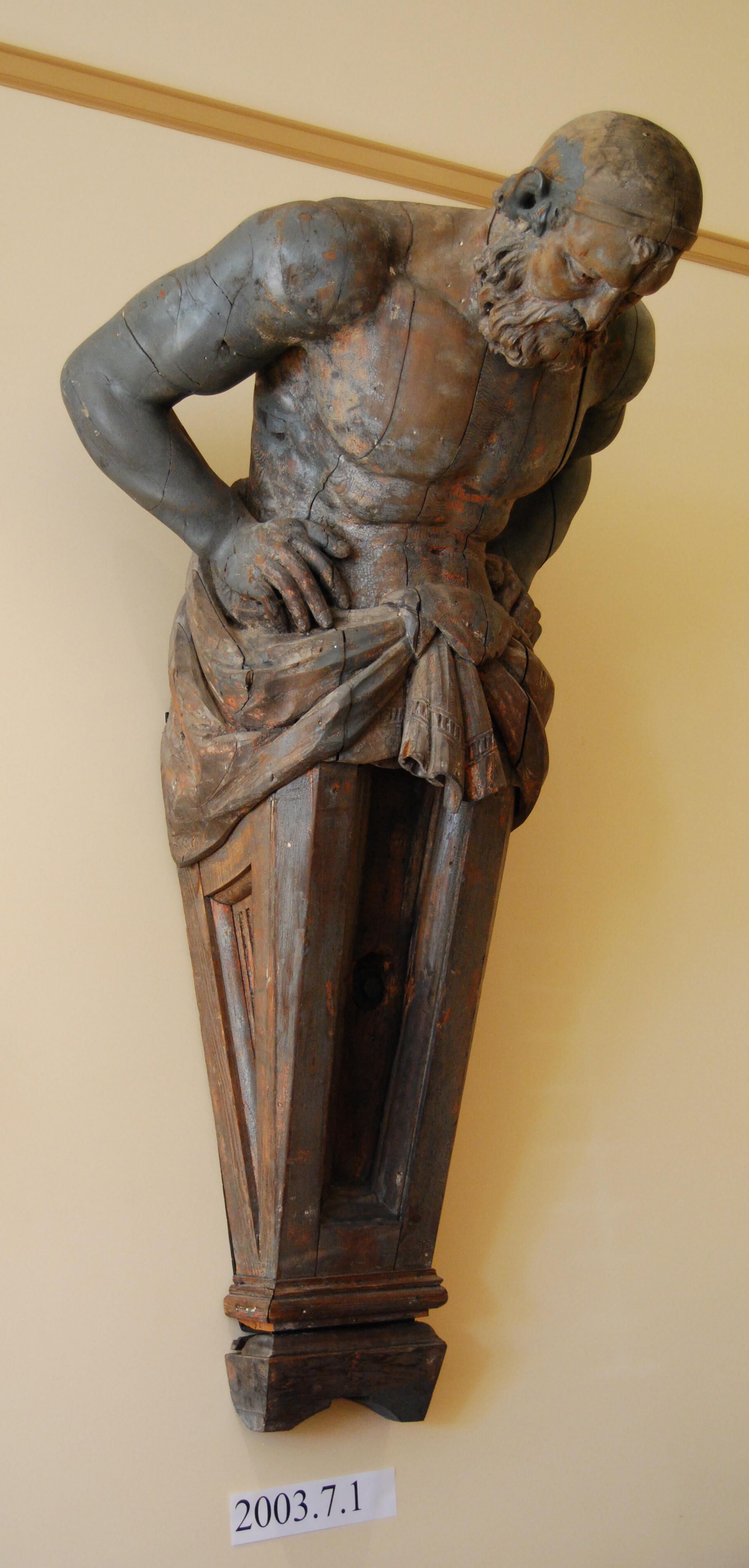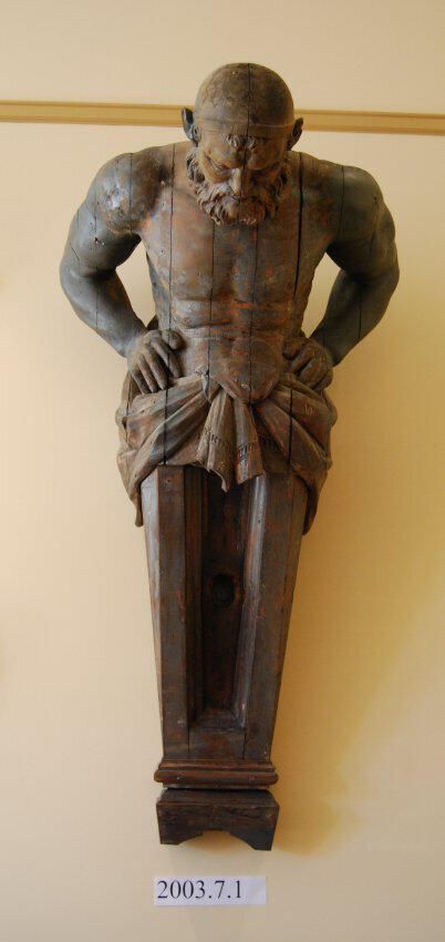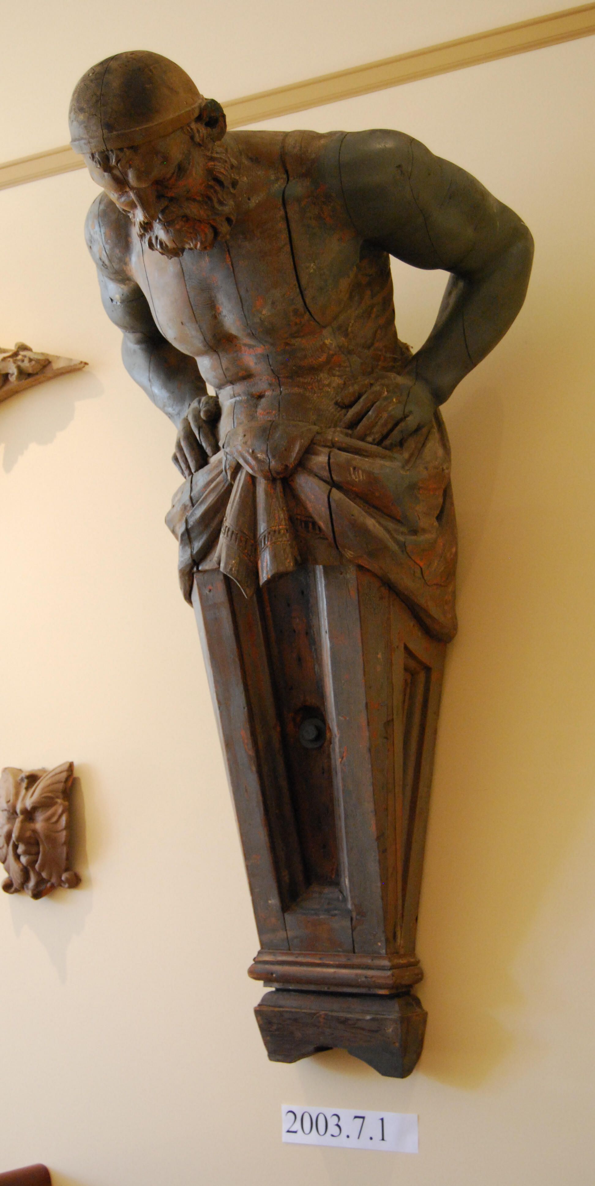 Bracket from 1884 Kamm Block, in form of monumental carved wood Hermes figure, used as a balcony support above main entrance, first floor, main (front) facade. AHC lobby.