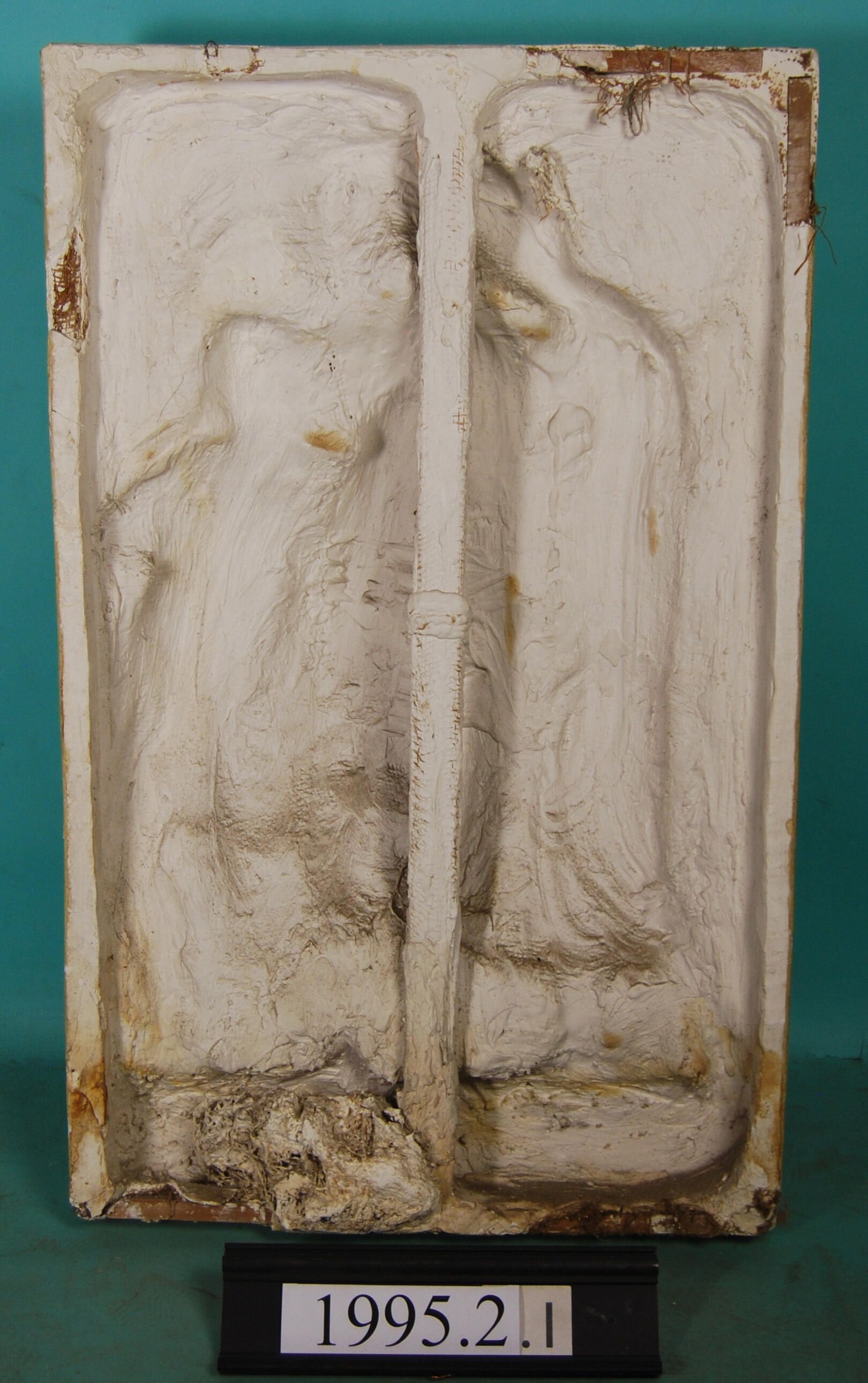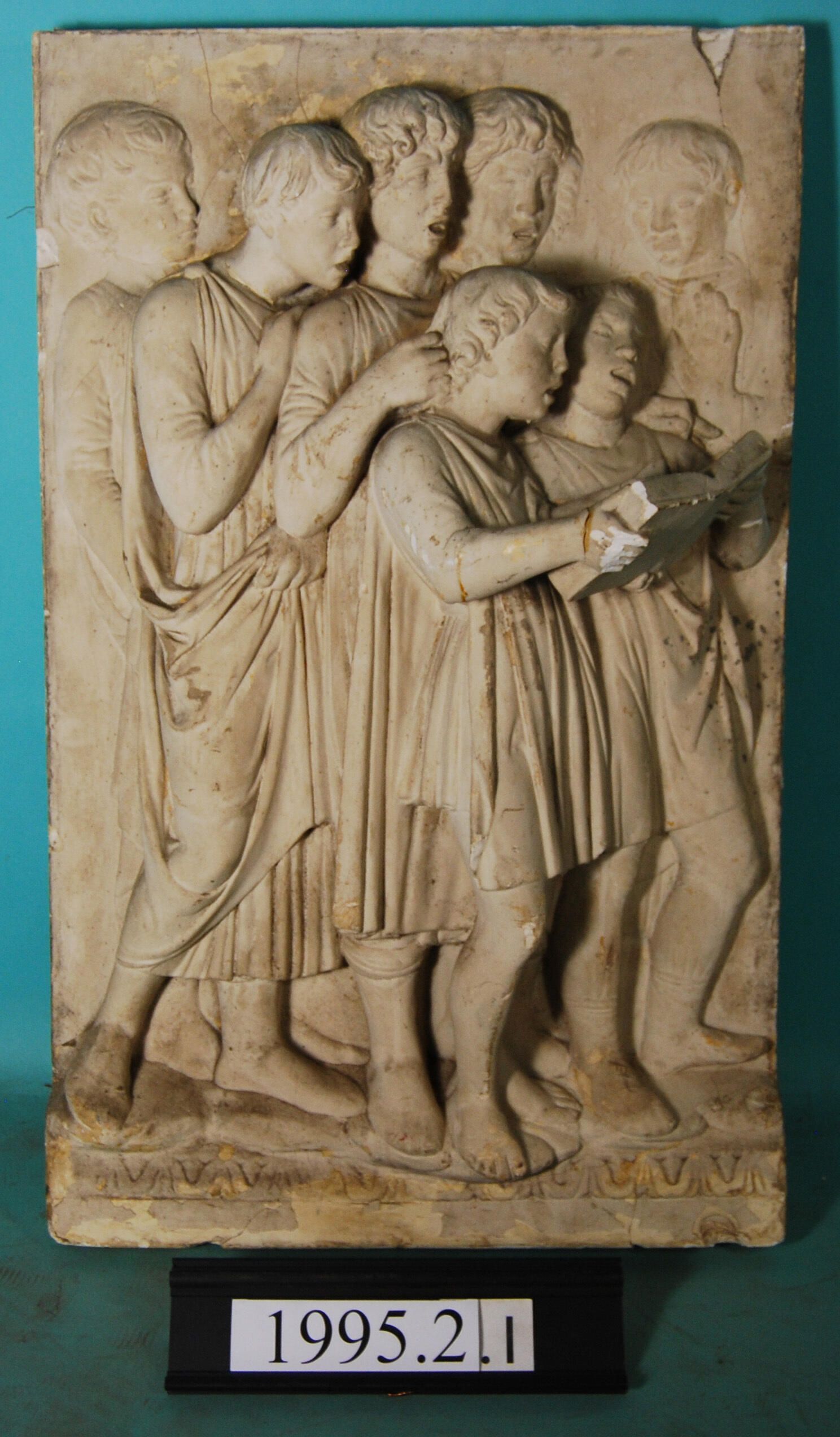 Plaster panel. Part of the historic plaster frieze from the former Lincoln High School, Portland, Oregon. Highly detailed with scenes from Psalm 150. Patterned after the Cantoria Frieze by Luca della Robbia. One of nine panels with figures. Has minor breaks and missing pieces. Painted white.