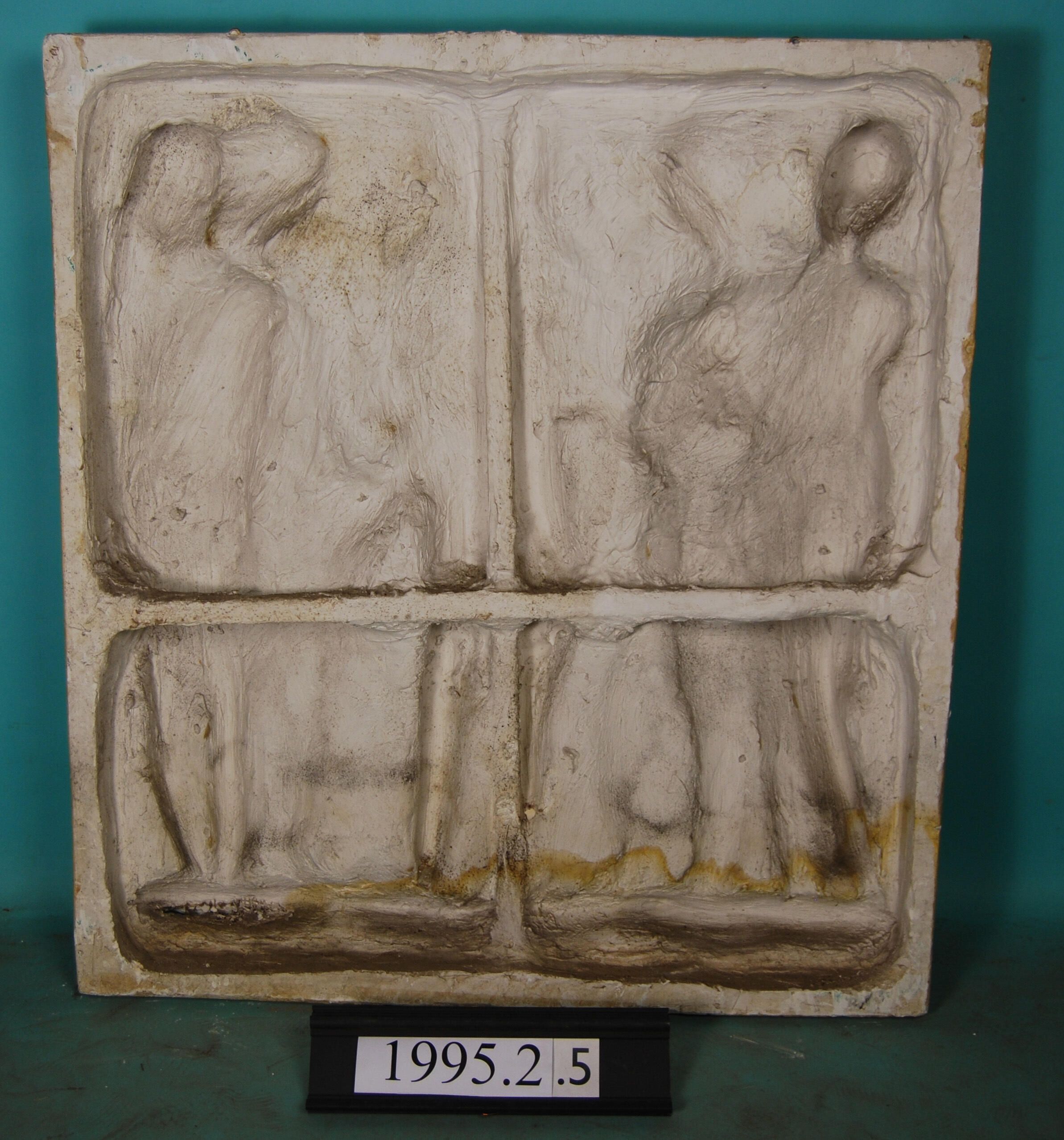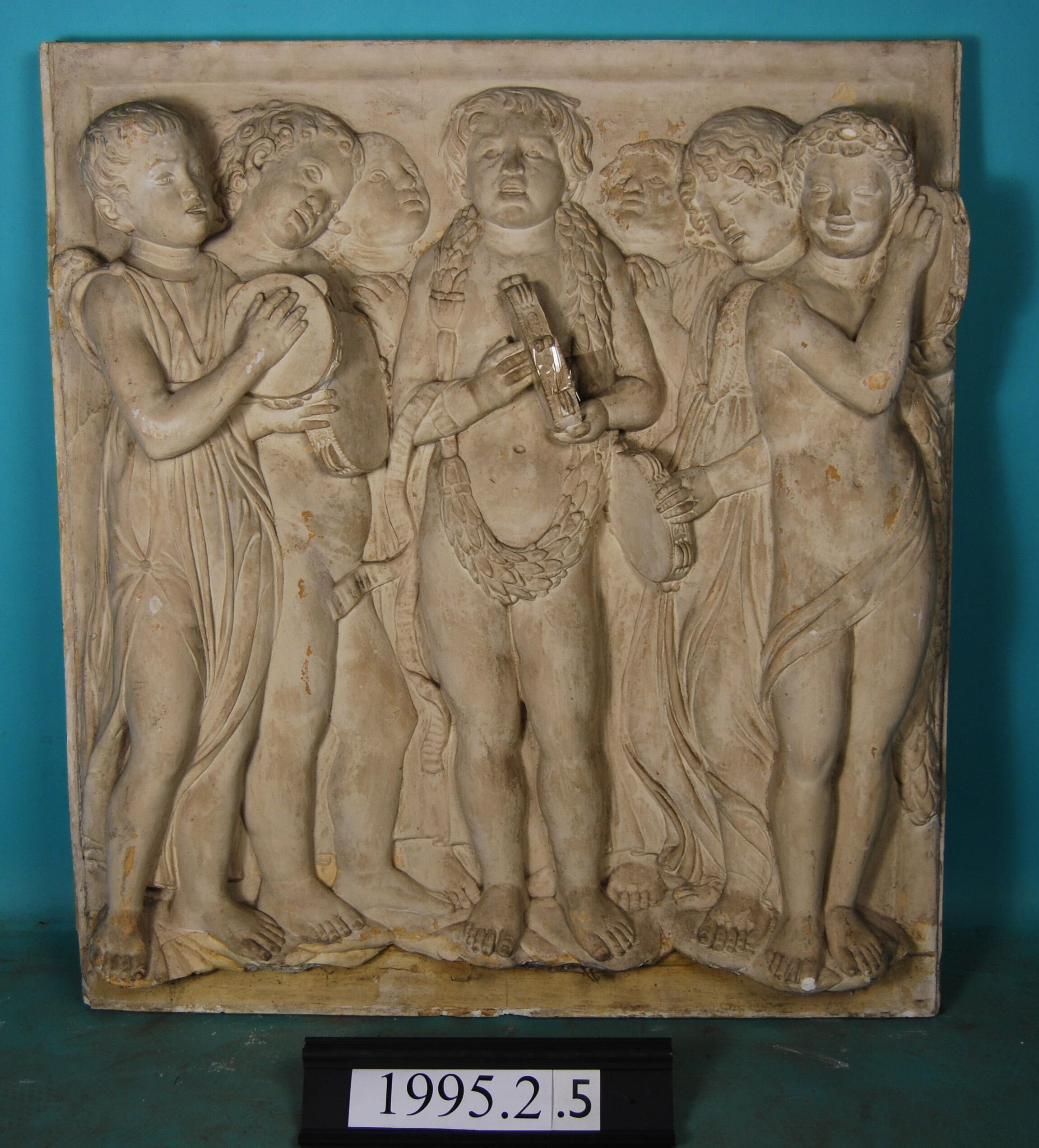 Plaster panel. Part of the historic plaster frieze from the former Lincoln High School, Portland, Oregon. Highly detailed with scenes from Psalm 150. Patterned after the Cantoria Frieze by Luca della Robbia. One of nine panels with figures. Painted white.