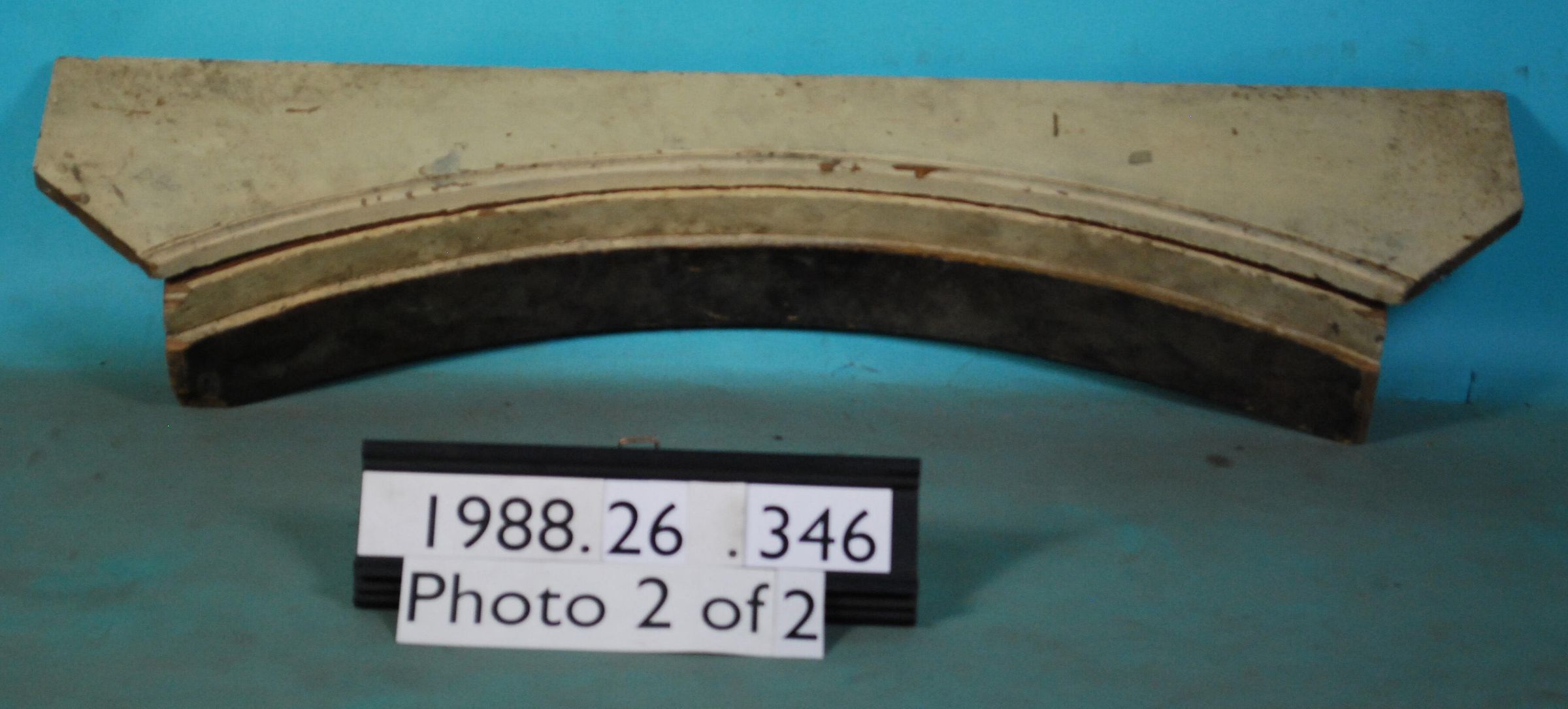 Interior wood door casing (header). Has arched bead edge. Mitred ends made of cedar. From ground level connecting building on north end to mid-section, St. Mary's Academy. Painted off-white. See also 1988.2.58 door.