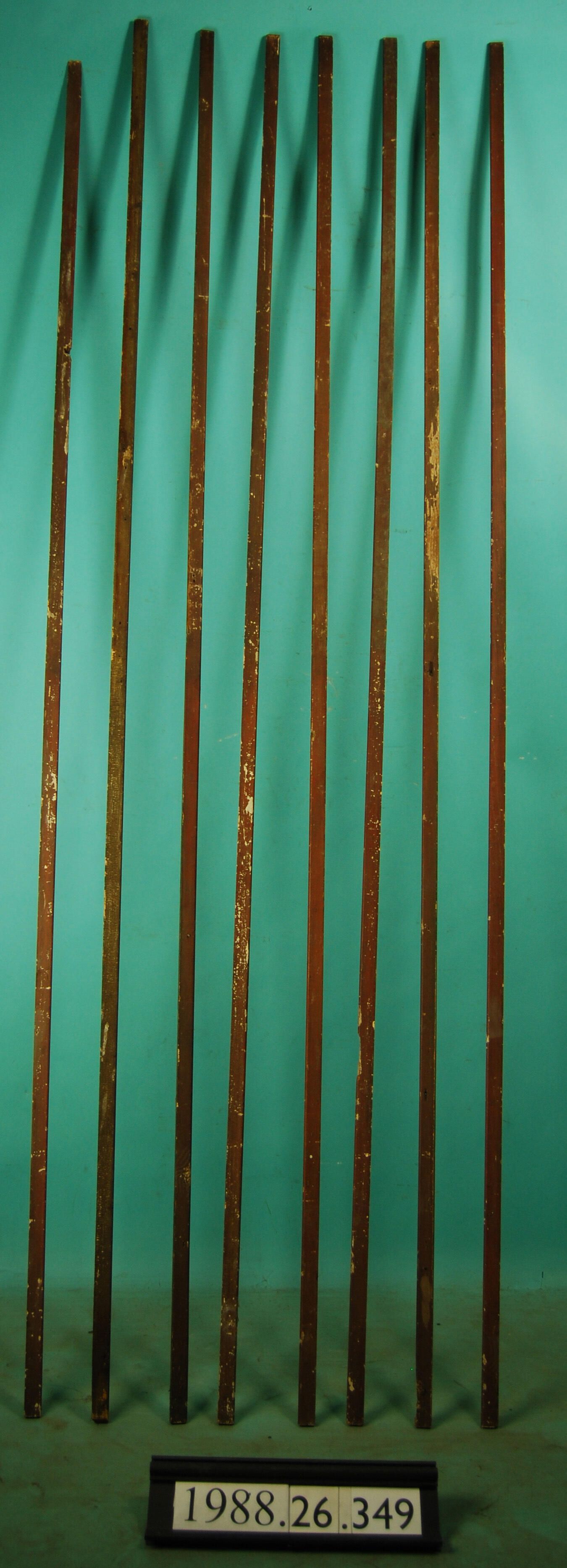 One lot of seven interior wood moldings. Possibly window trim? Made of softwood. Painted faux wood grain. Type: Inscriptions or Markings: Manufacturer: Place of Manufacture: Design motif: Style: Finish: Painted Faux Wood Grain