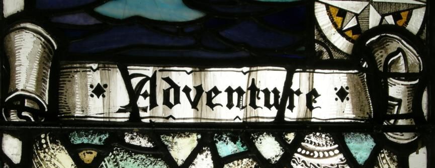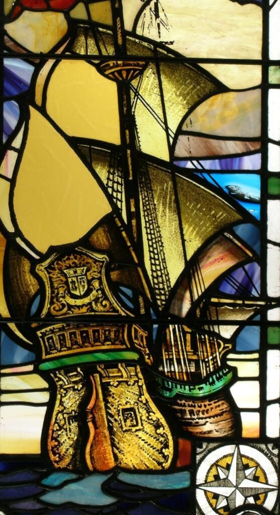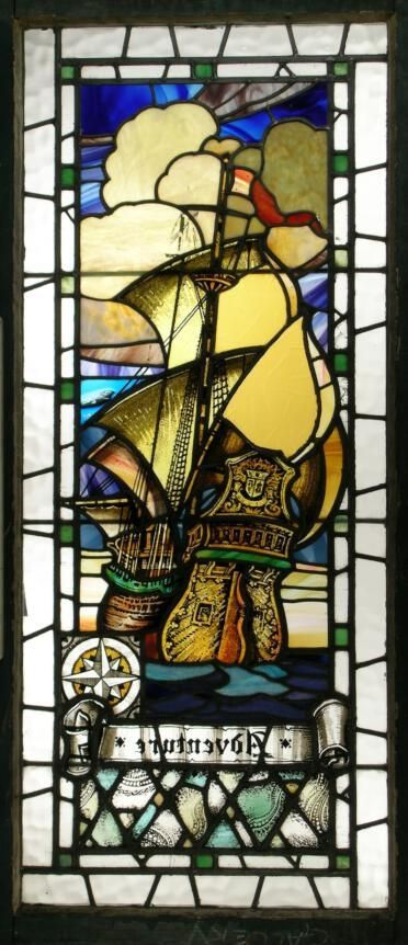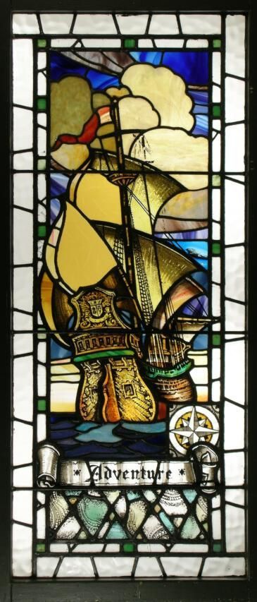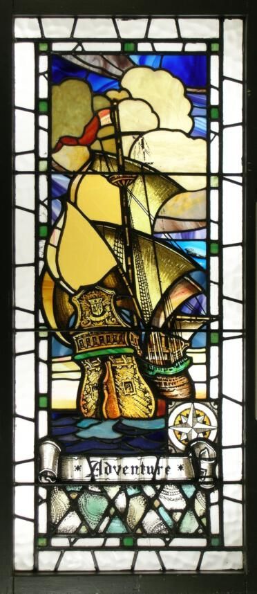 Theme window - painted window with ship, "Adventure" with windrose, compass. Very colored, dynamic, with details of ships and sails. A wood galleon, full sail. Very thick, solid leading. Later window, storybook, illustration trying to capture older styles.