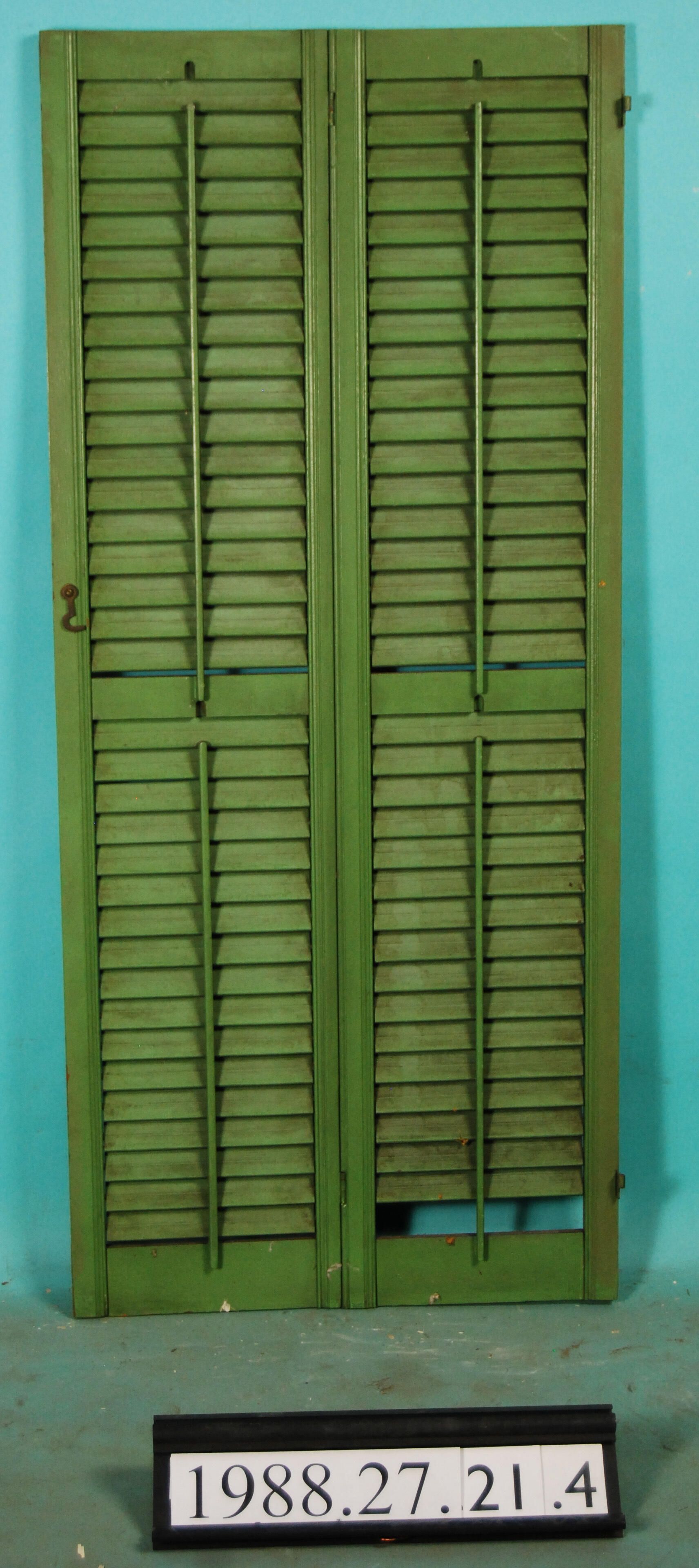 Pair of interior wood louvered shutters joined with hinges. Painted green. Finish: Painted Green. Material: Wood