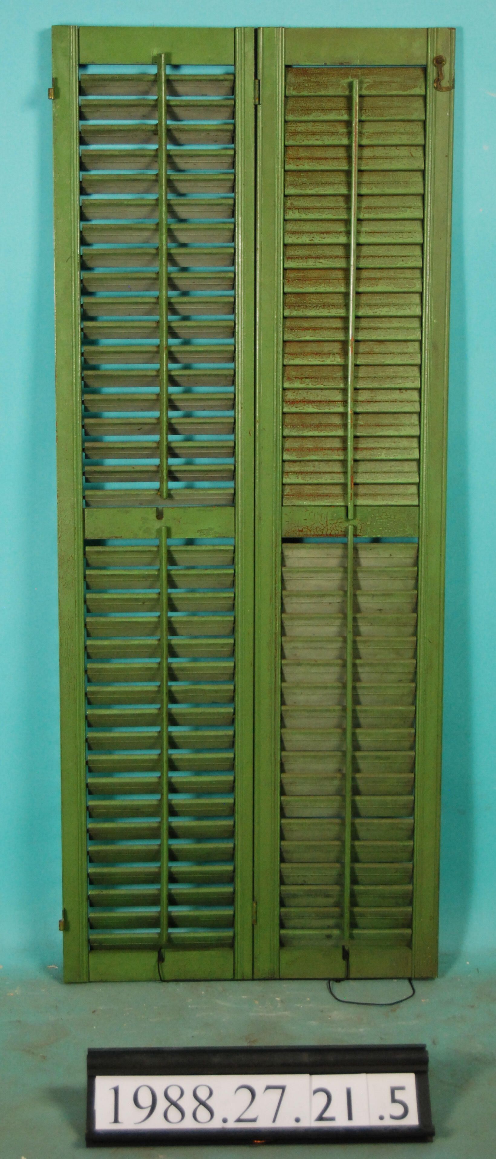 Pair of interior wood louvered shutters joined with hinges. Painted green. Finish: Painted Green. Material: Wood