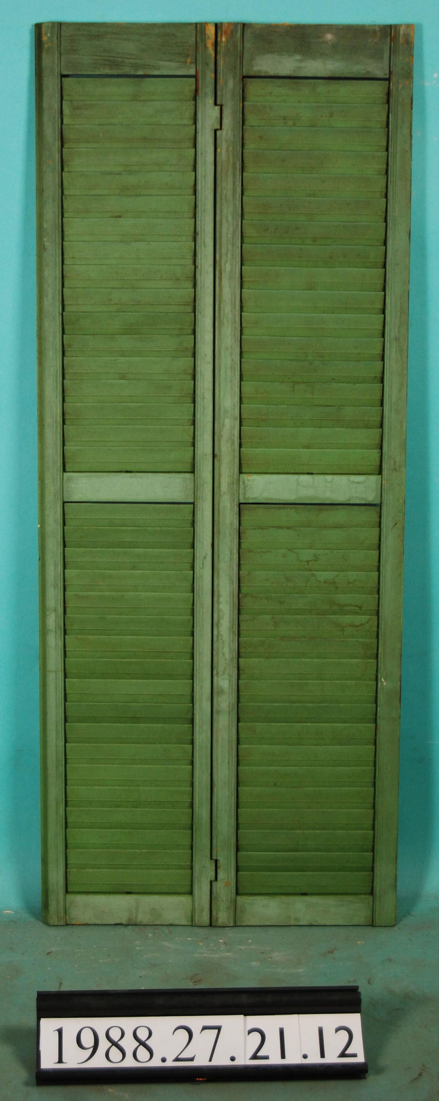 Pair of interior wood louvered shutters joined with hinges. Painted green. Finish: Painted Green. Material: Wood