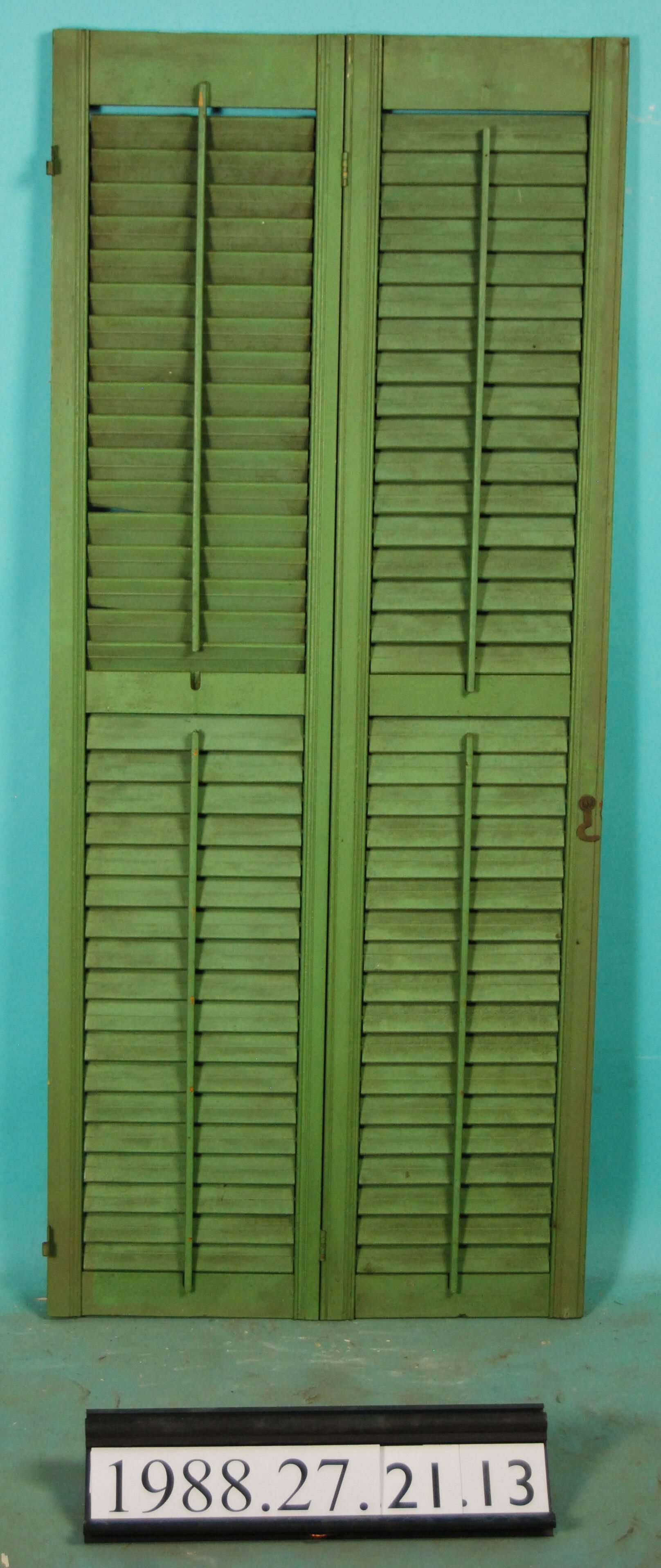 Pair of interior wood louvered shutters joined with hinges. Painted green. Finish: Painted Green. Material: Wood