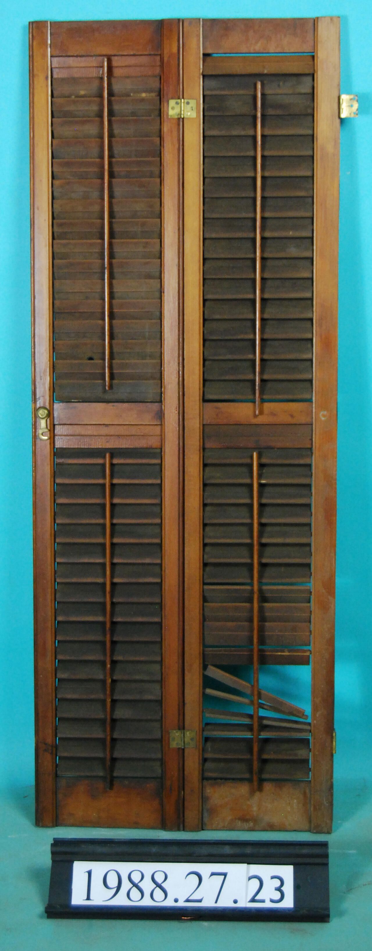 Pair of interior wood louvered shutters joined with hinges. Varnished. Finish: Varnished Material: Wood