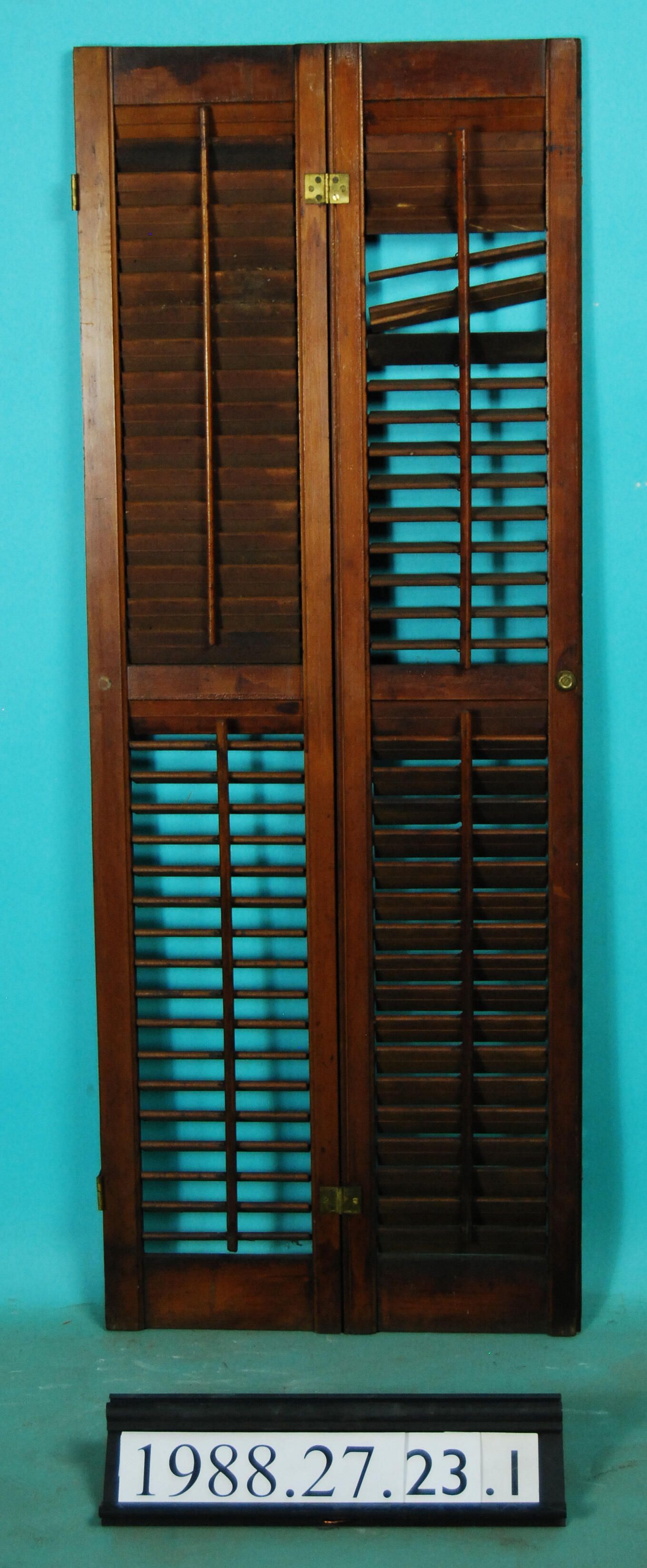 Pair of interior wood louvered shutters joined with hinges. Varnished. Finish: Varnished Material: Wood
