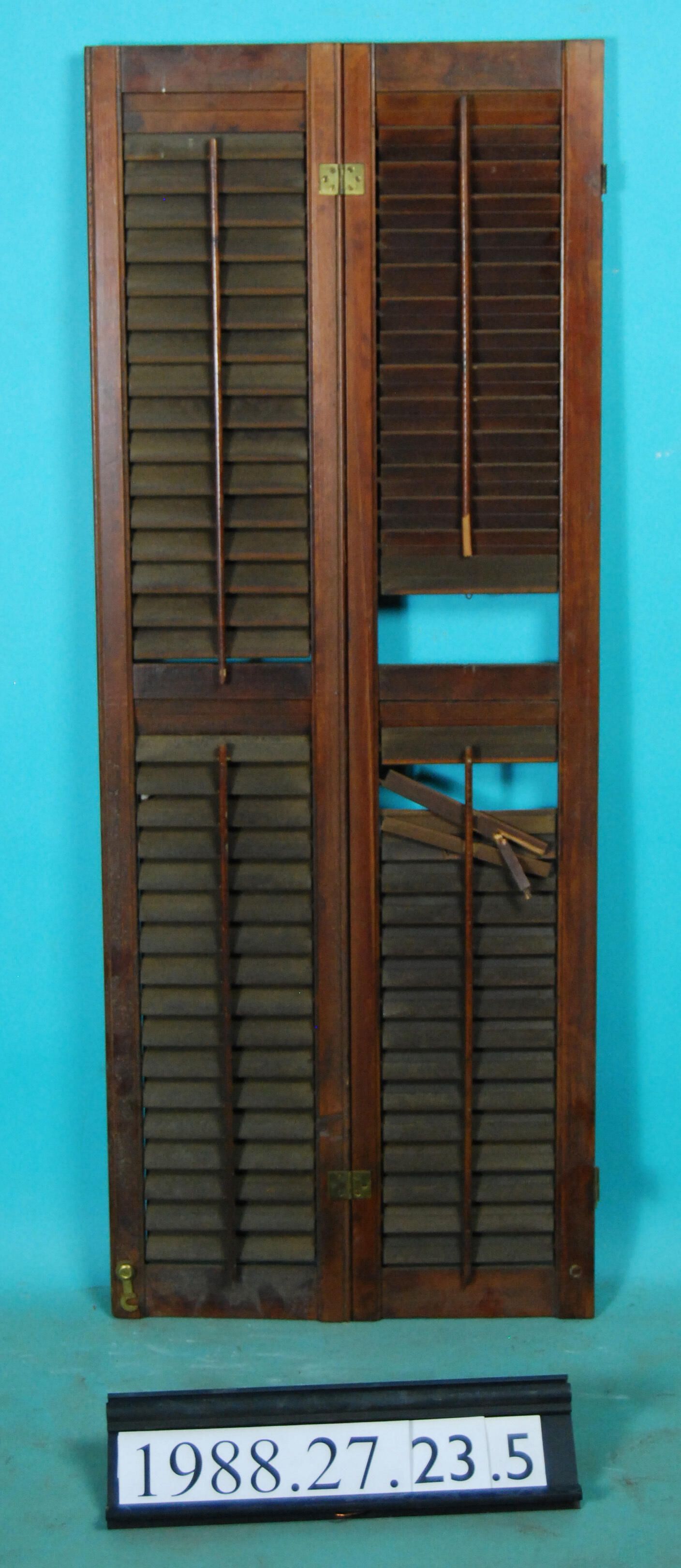 Pair of interior wood louvered shutters joined with hinges. Varnished. Finish: Varnished Material: Wood