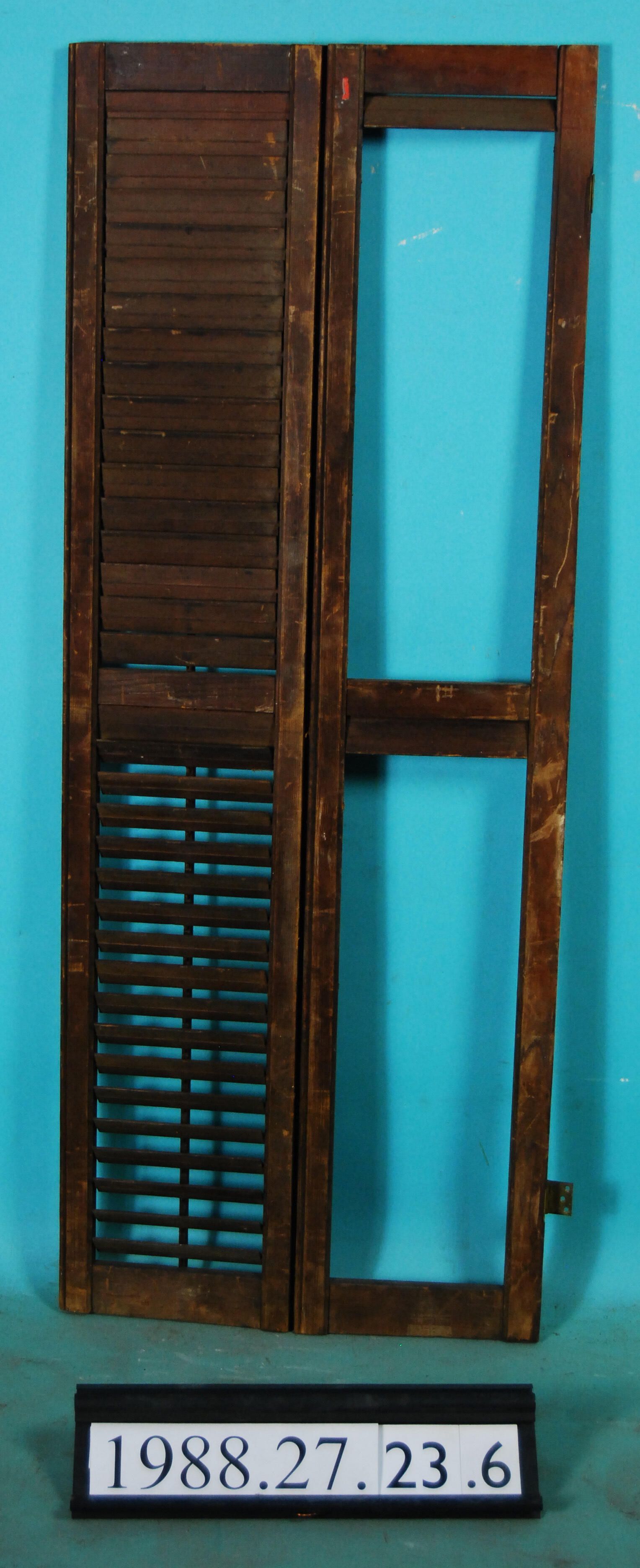 Pair of interior wood shutters joined with hinges. Varnished. Finish: Varnished Material: Wood