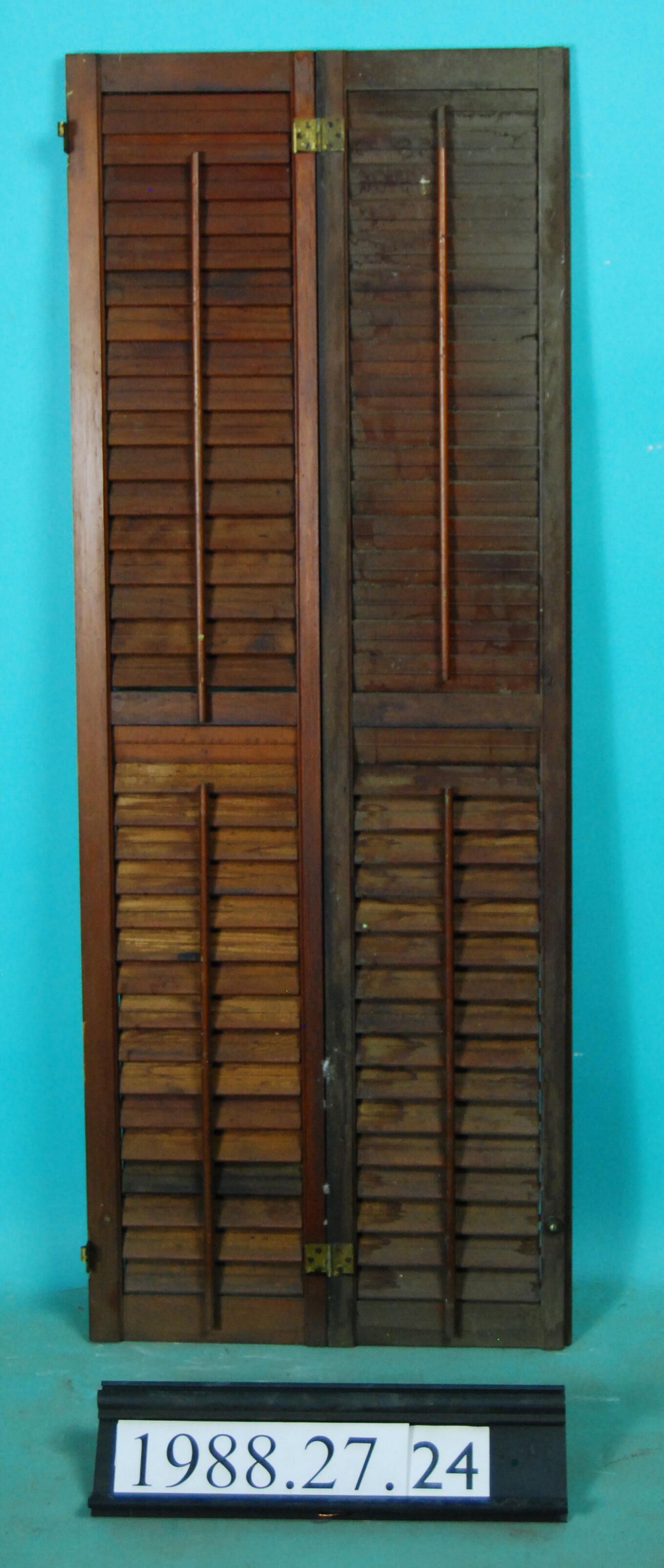 Pair of interior wood louvered shutters joined with hinges. Varnished. Finish: Varnished Material: Wood