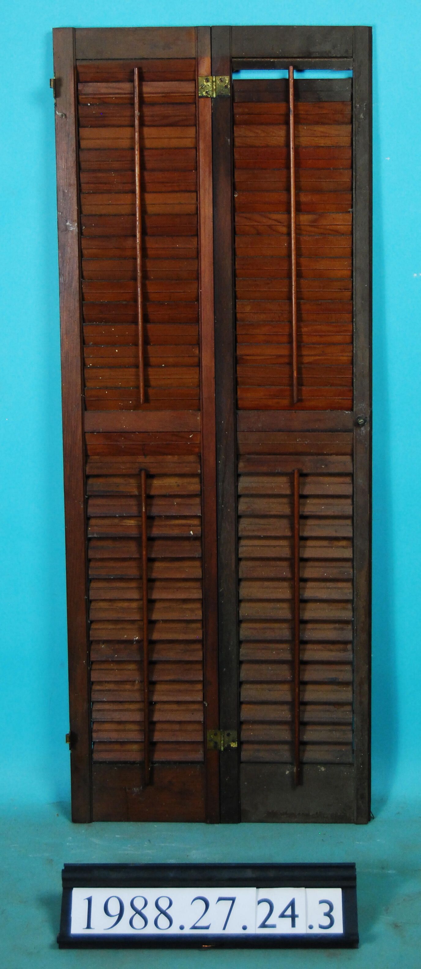 Pair of interior wood louvered shutters joined with hinges. Varnished. Finish: Varnished Material: Wood