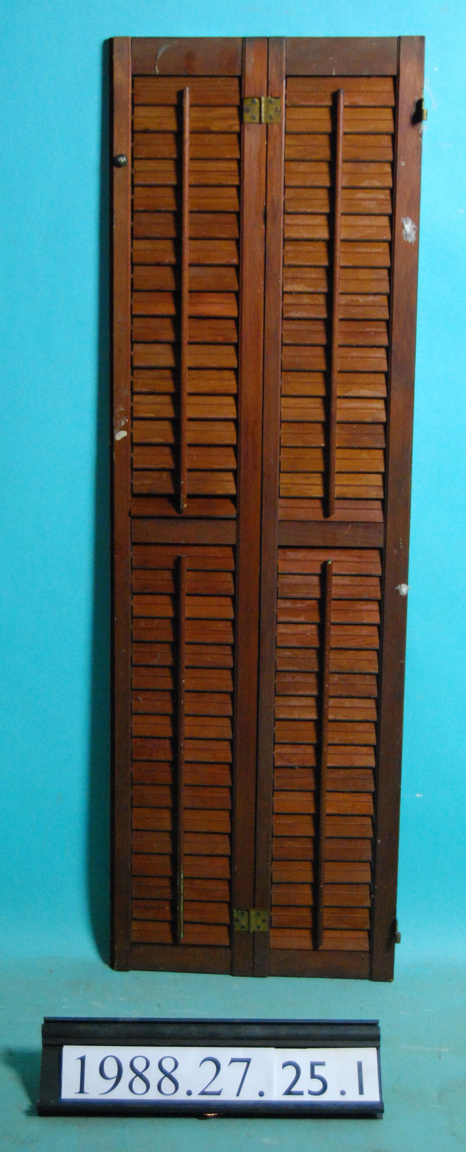 Pair of interior wood louvered shutters joined with hinges. Varnished. Finish: Varnished Material: Wood