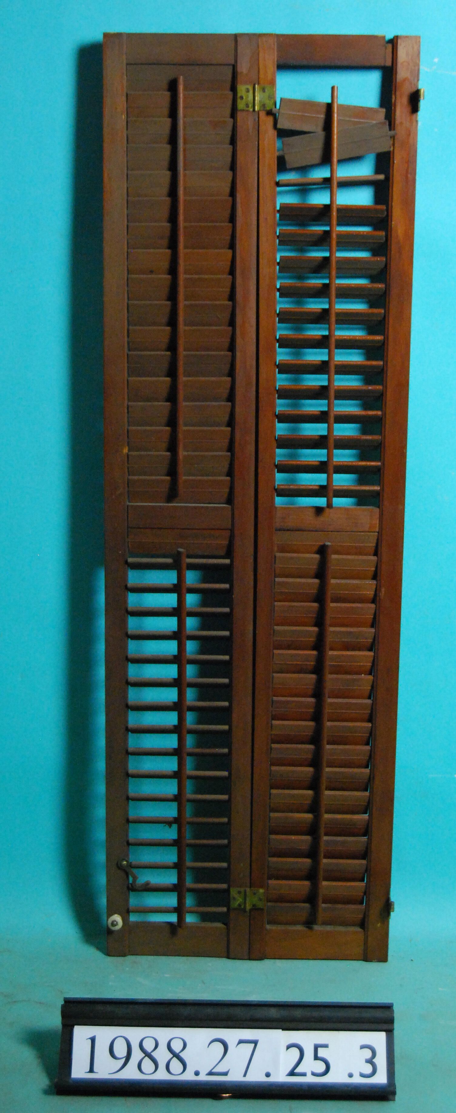 Pair of interior wood louvered shutters joined with hinges. Varnished. Finish: Varnished Material: Wood