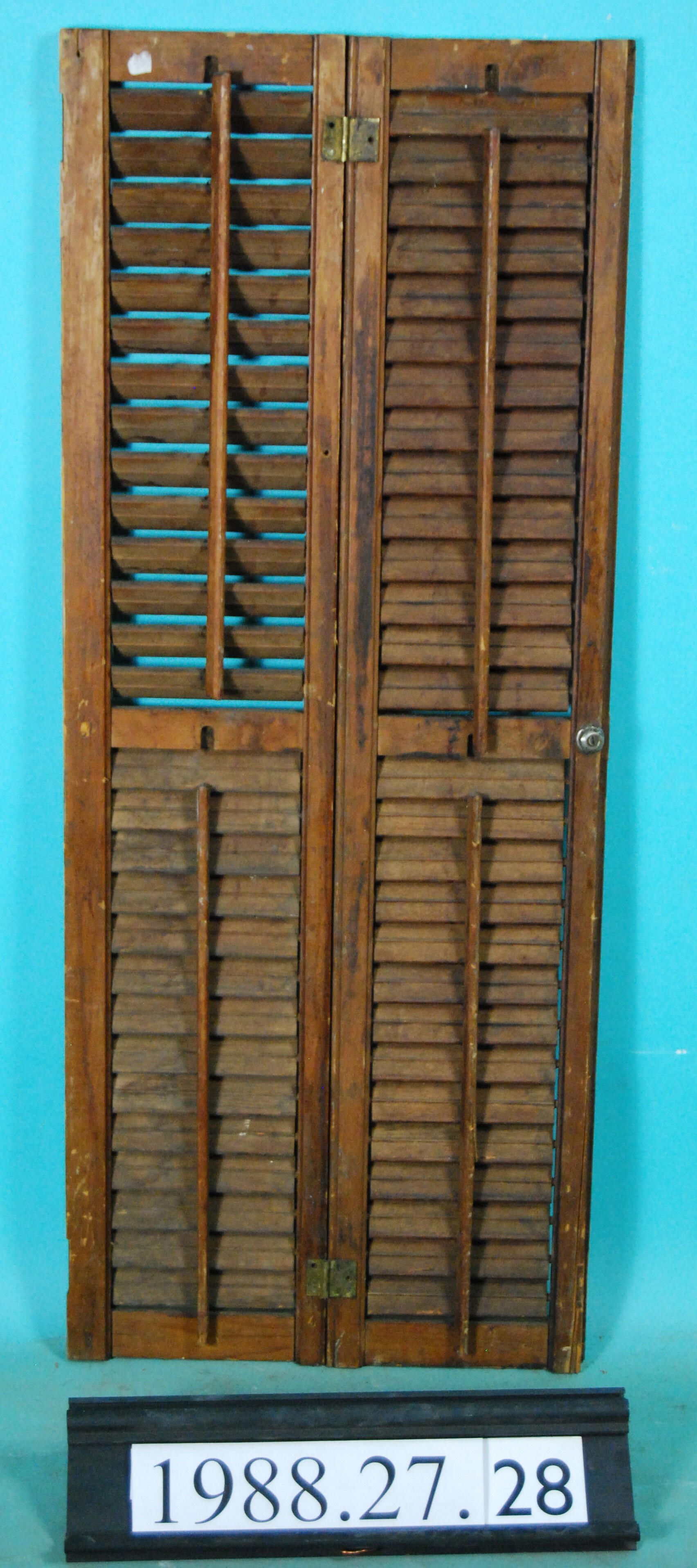 Pair of interior wood shutters joined with hinges. Varnished. Finish: Varnished Material: Wood