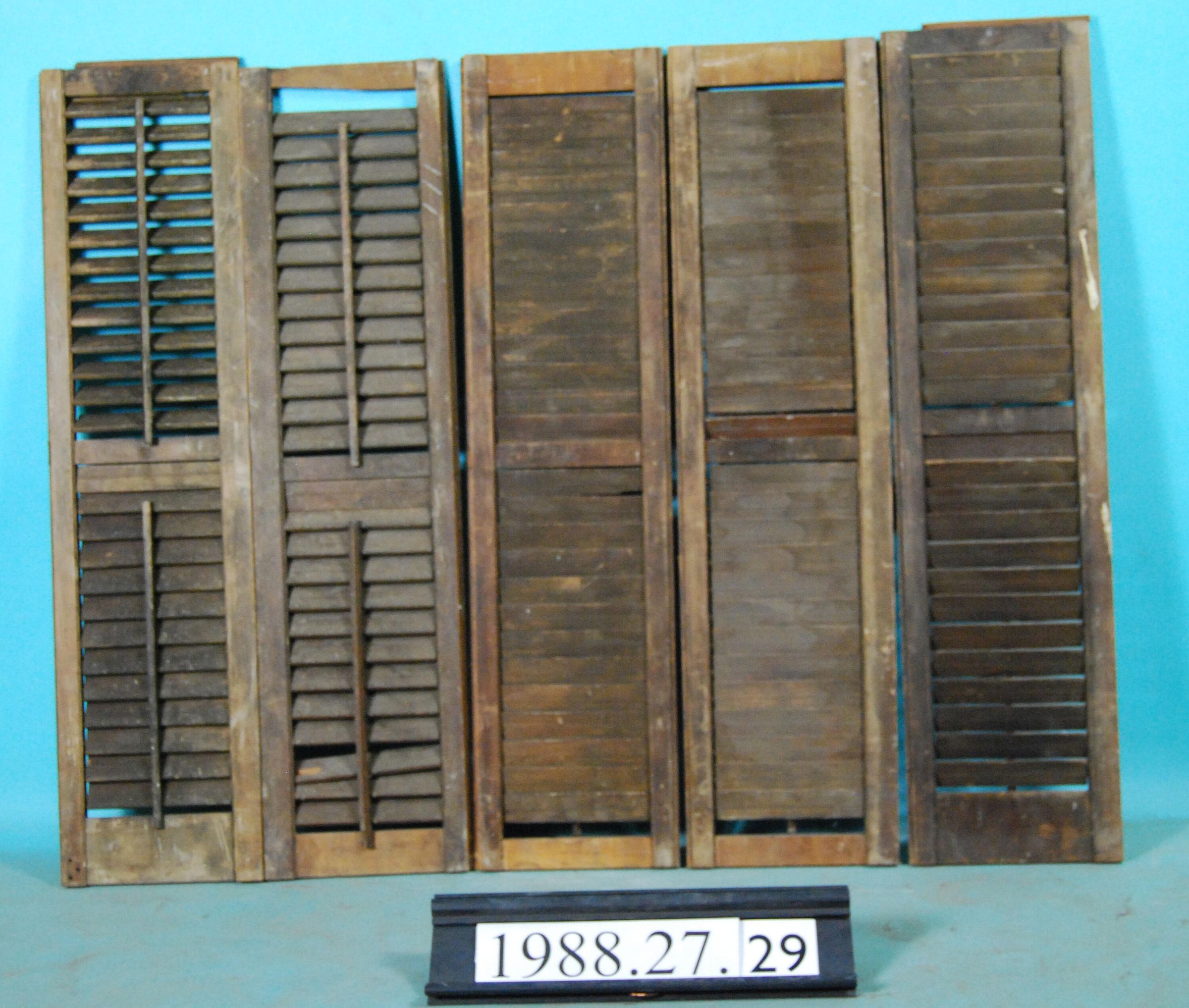 One lot of five interior shutter leaves, modified with repairs - no hardware. Varnished. Finish: Varnished Material: Wood