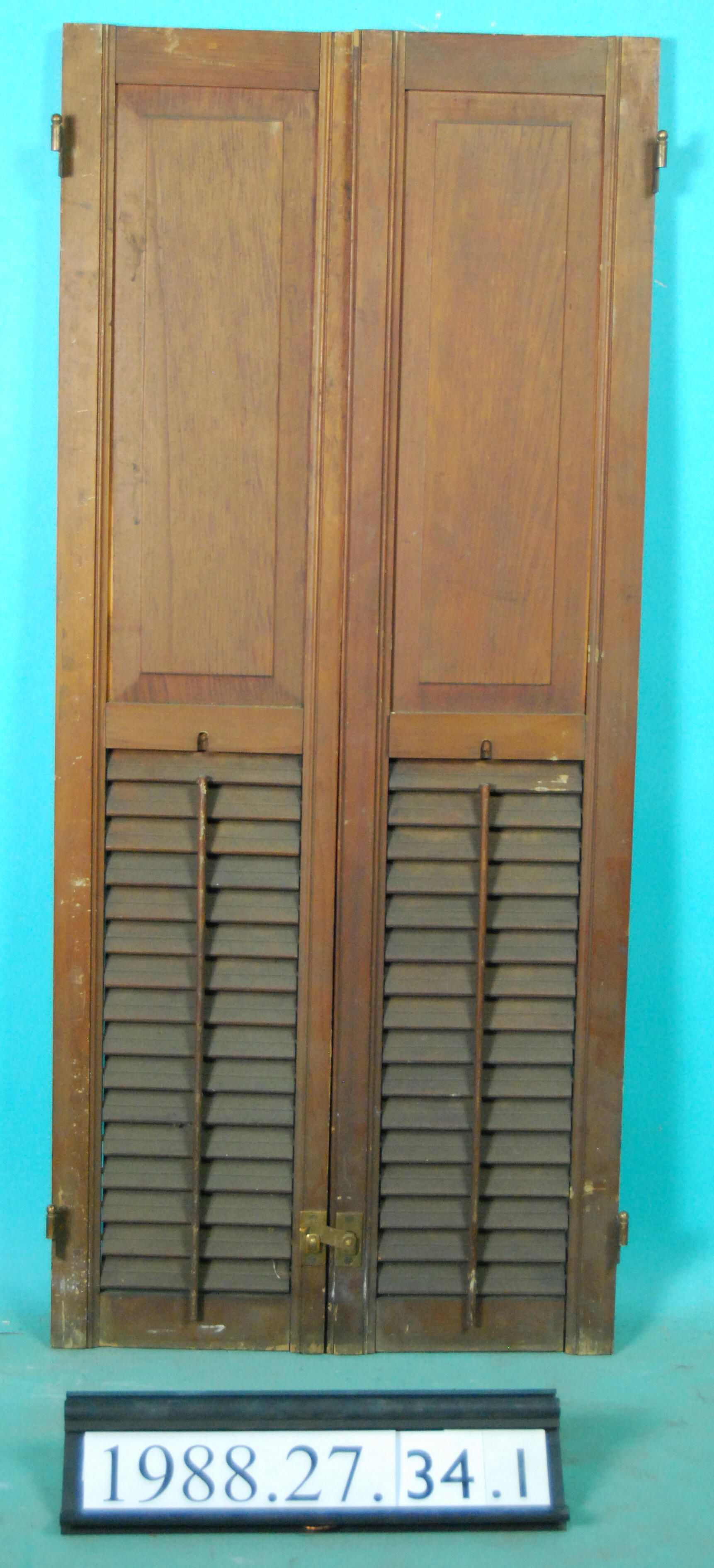 Two interior wood shutters - not joined with hinges, but matching. Upper part of each has solid panel - lower part is louvered. Varnished. Finish: Varnished Material: Wood