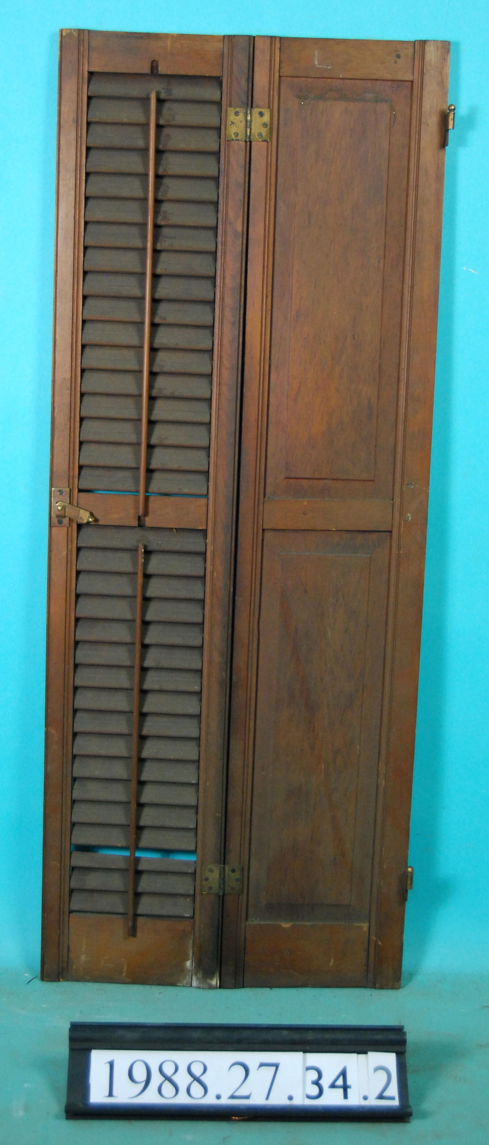 Pair of interior wood shutters; joined with hinges. One shutter leaf is louvered - the other shutter leaf ha solid panels. Varnished. Finish: Varnished Material: Wood