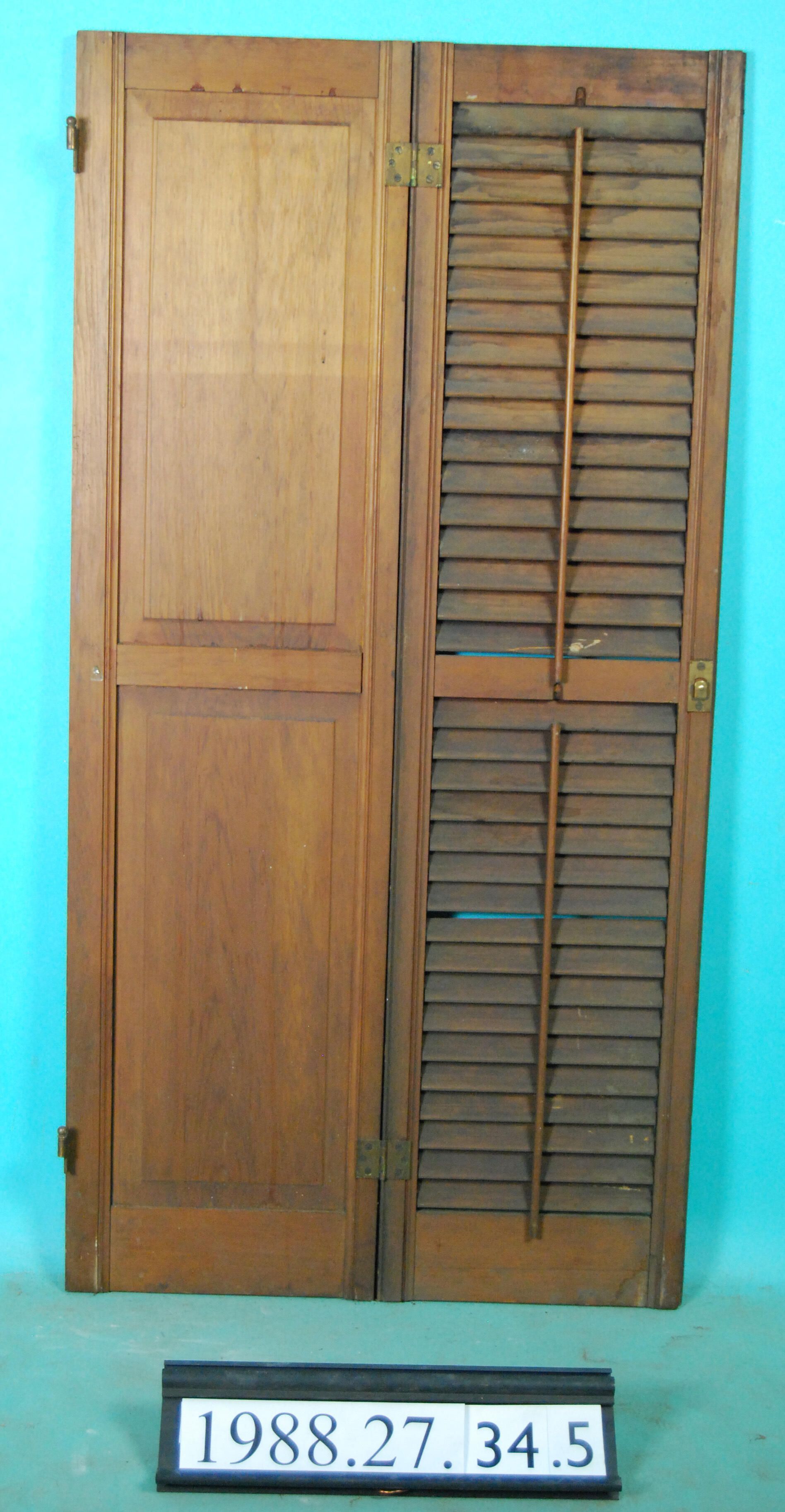 Pair of interior wood shutters joined with hinges. One shutter leaf is louvered. Other shutter leaf has two panels. Varnished. Finish: Varnished Material: Wood