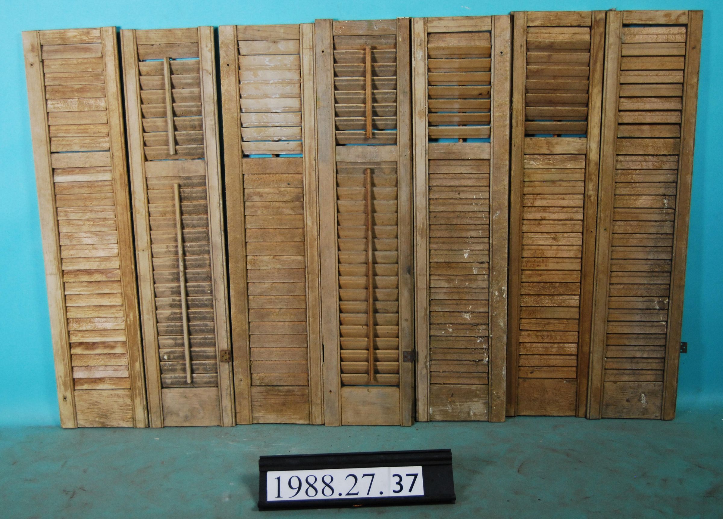 One lot of seven interior wood shutter leaves. Each has louvers. All have been stripped of finish. Stripped. Finish: Stripped Material: Wood