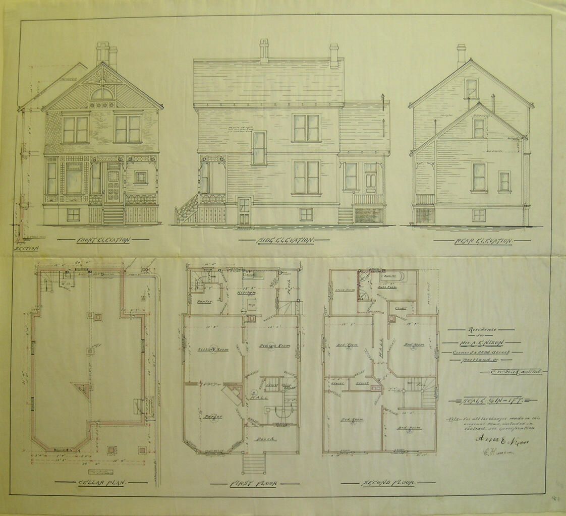 List of Drawings in set: front elevation, side elevation, rear elevation, cellar plan, 1st floor plan, 2nd floor plan, section (partial).Lexicon