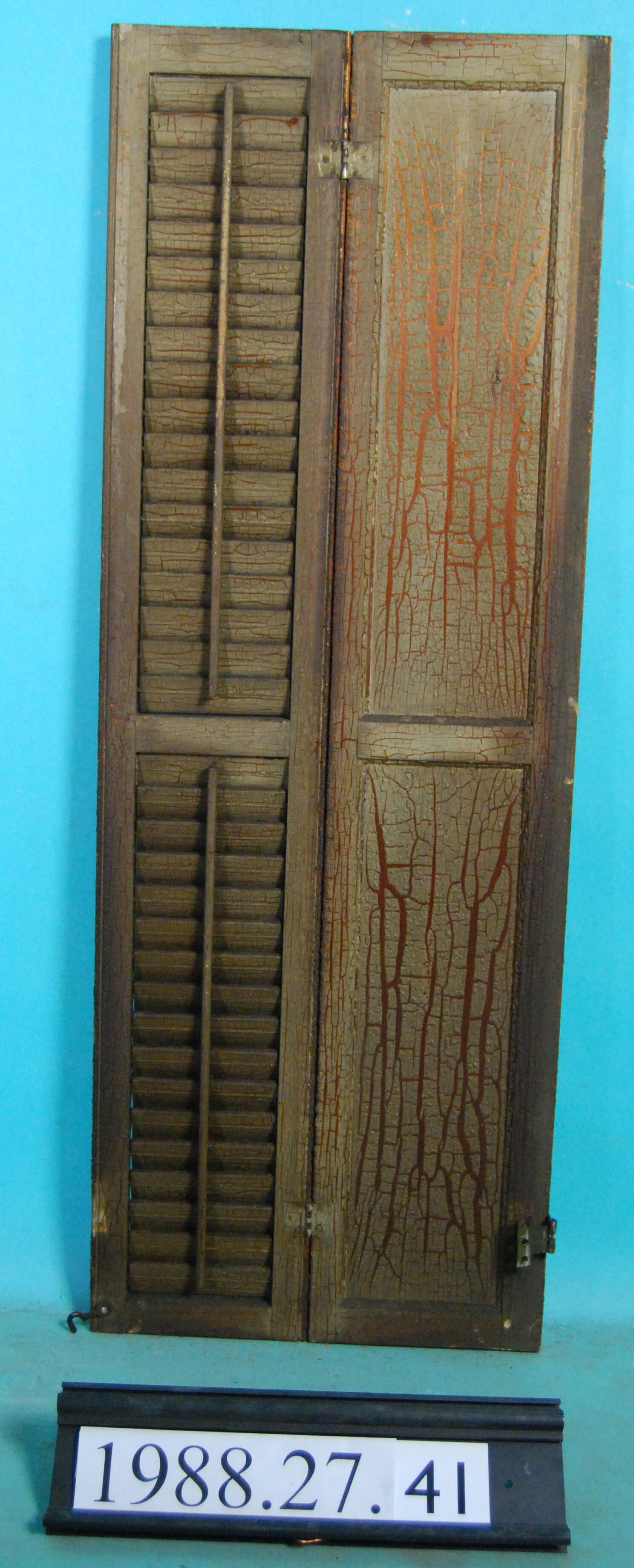 Pair of interior wood shutter leaves - joined with hinges. One leaf louvered - other leaf has panels. Varnished / Painted. Finish: Varnished / Painted Material: Wood