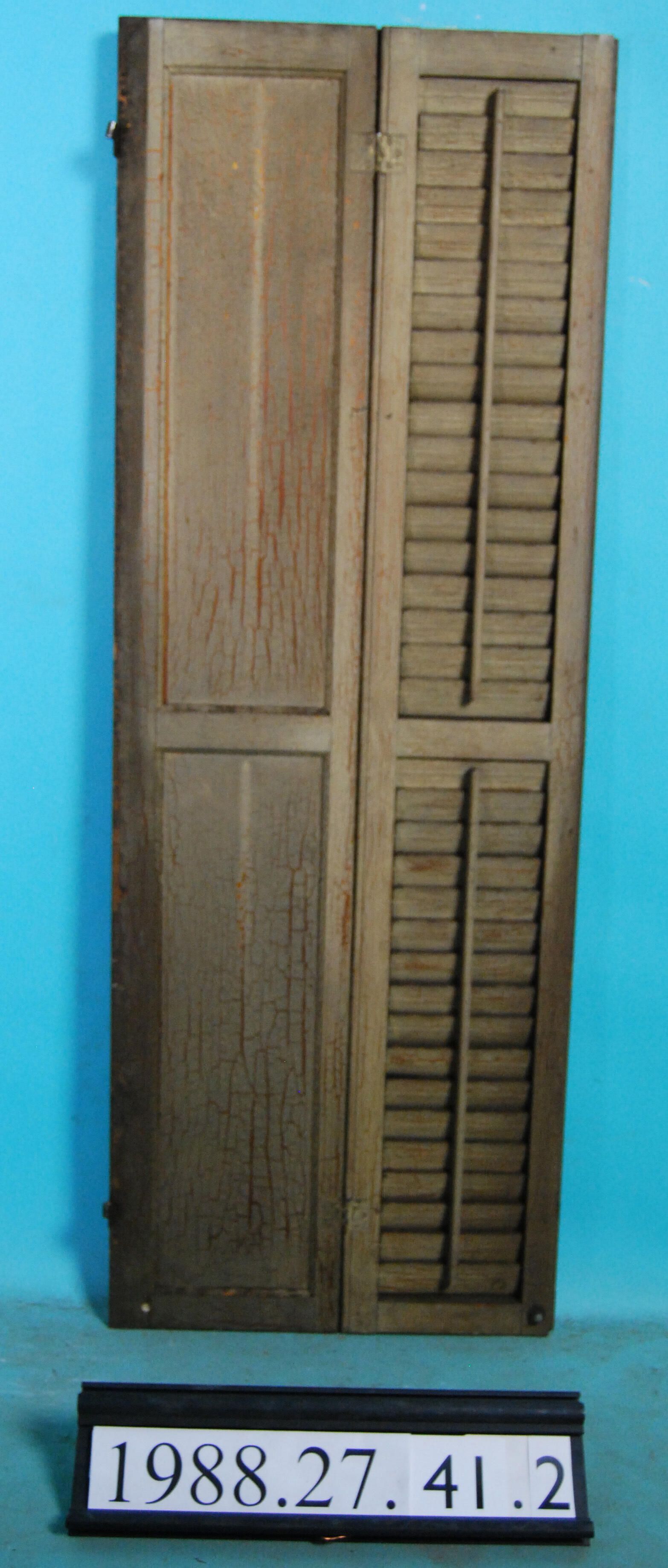 Pair of interior wood shutter leaves - joined with hinges. One leaf louvered - other leaf has panels. Varnished / Painted. Finish: Varnished / Painted Material: Wood