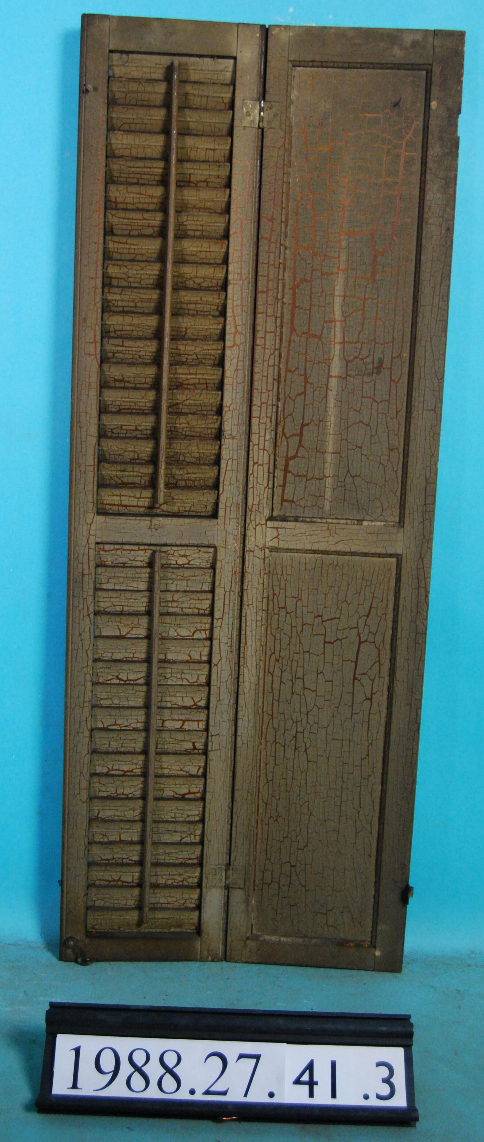 Pair of interior wood shutter leaves - joined with hinges. One leaf louvered - other leaf has panels. Varnished / Painted. Finish: Varnished / Painted Material: Wood