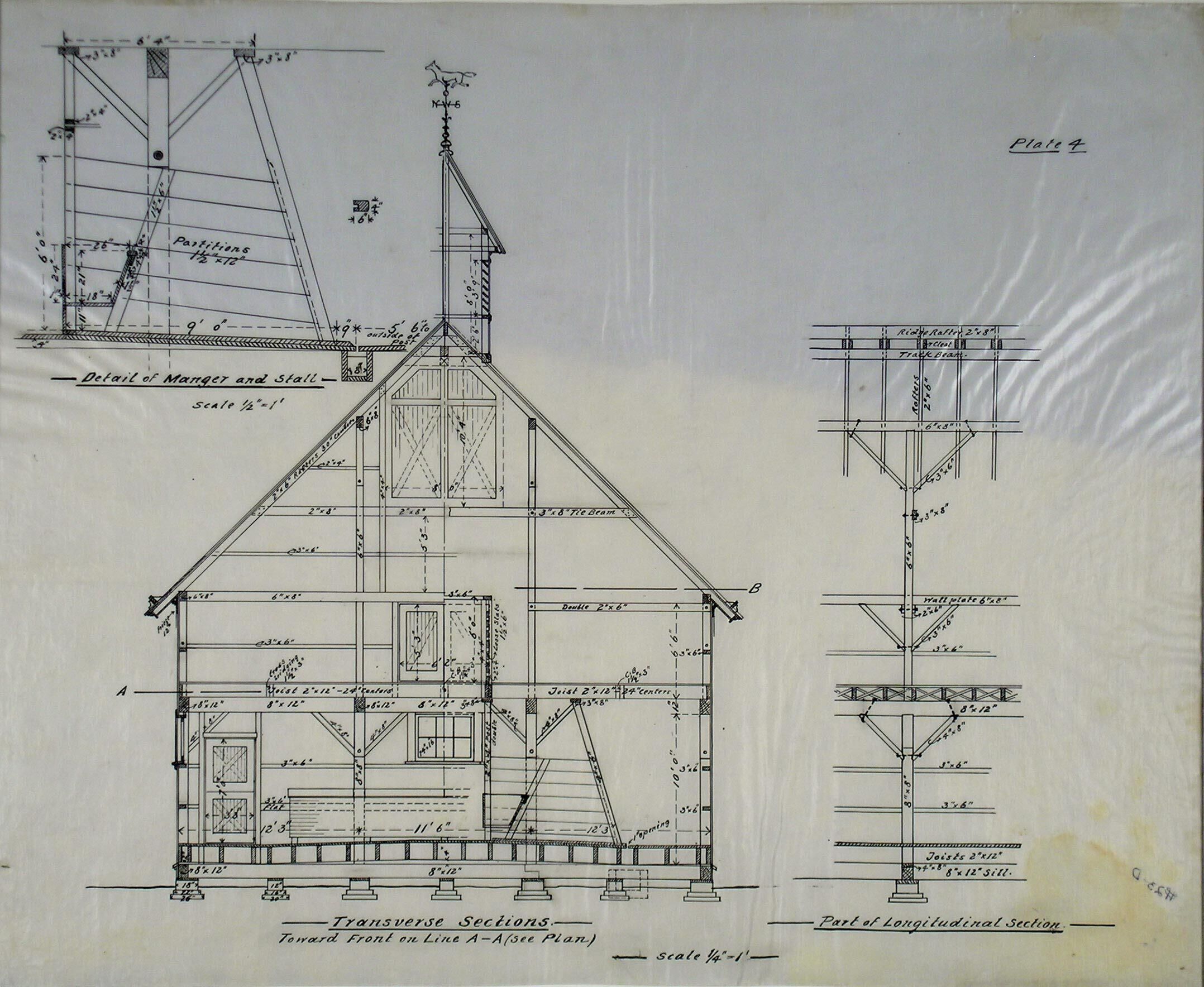 List of Drawings in set: transverse sections, longitudinal sections, detail of manger & stallLexicon