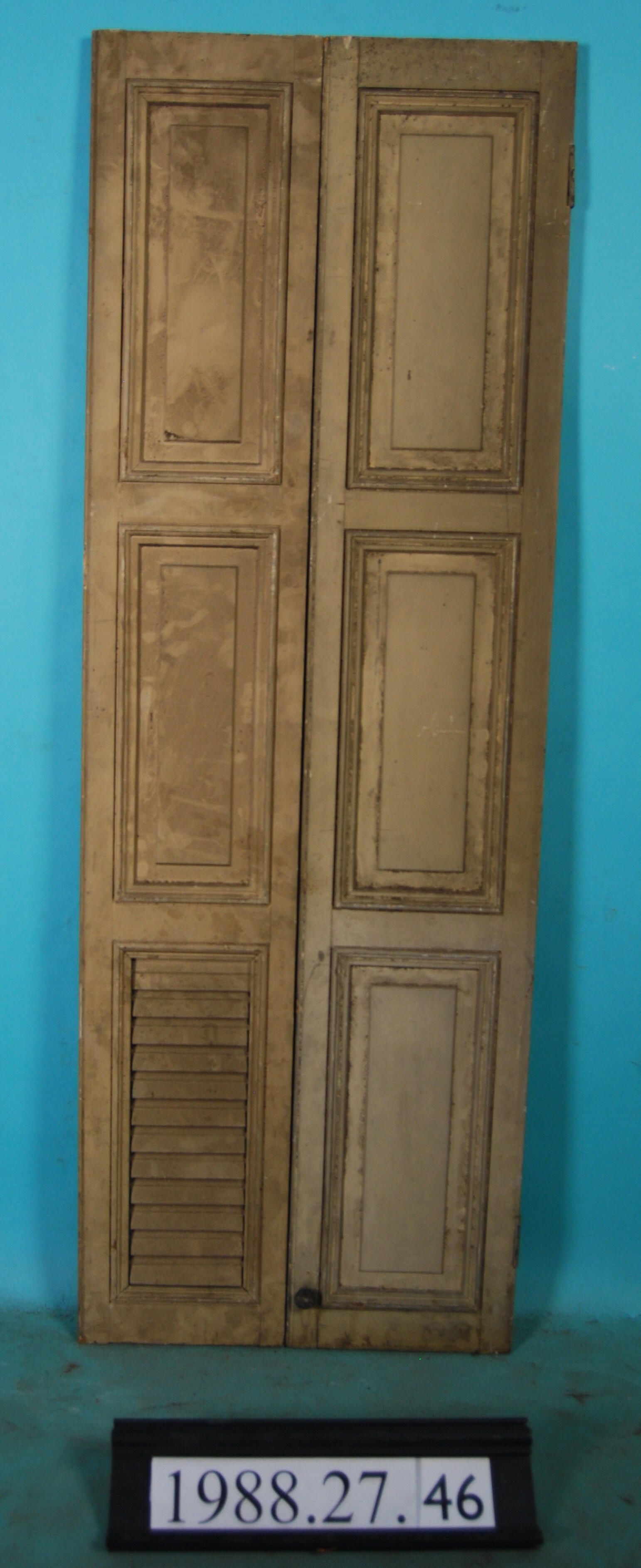 Two interior wood shutter leaves - joined with hinges. One leaf has three panels. Other leaf has two panels and one louvered section. Painted. Finish: Painted Material: Wood