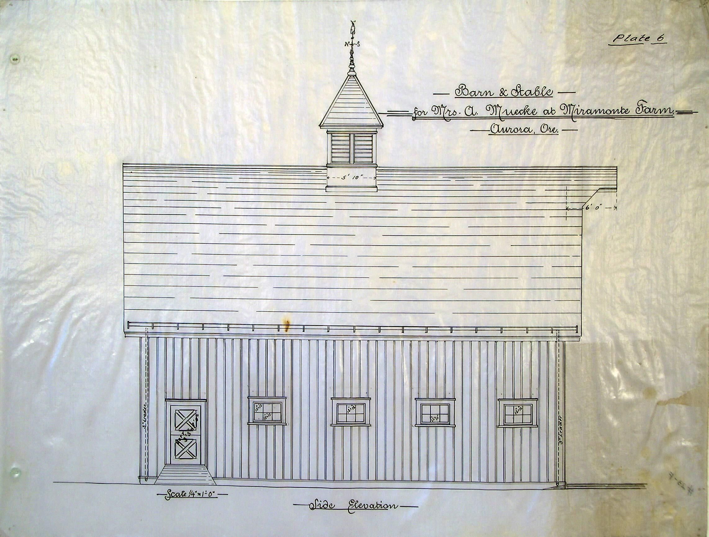Building Name: Barn & Stable for Mrs. A. Muecke at Miramonte Farm Building Location: Aurora, OR Architect: C.W. Leick Still Existing?: unknown Building Description: Large board and batten barn List of Drawings in set: Side elevation