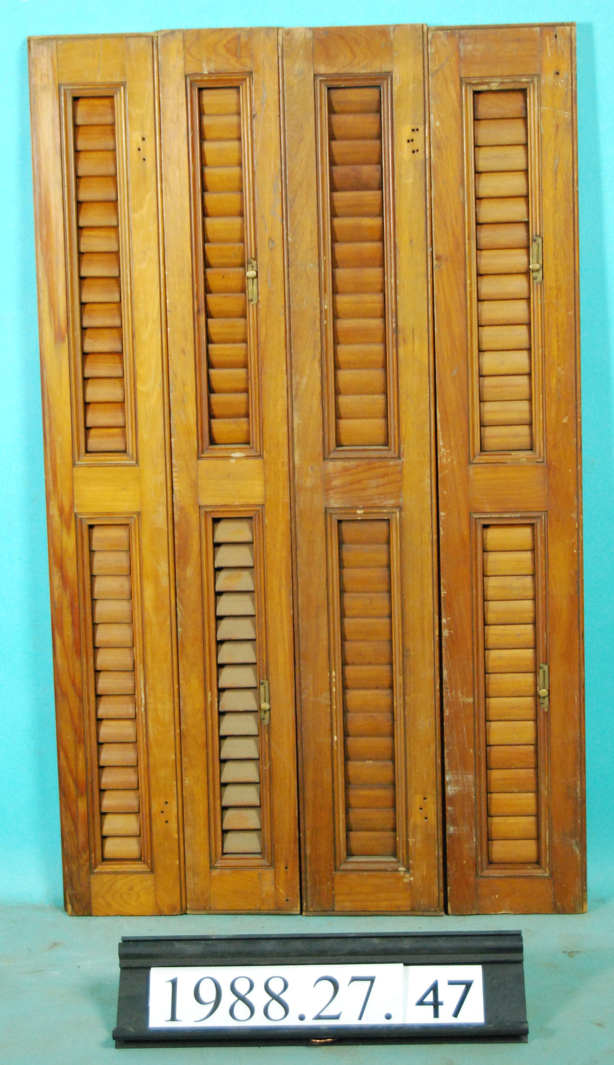 One lot of four interior wood shutter leaves - all hinges are missing. Finish: varnished Material: Wood