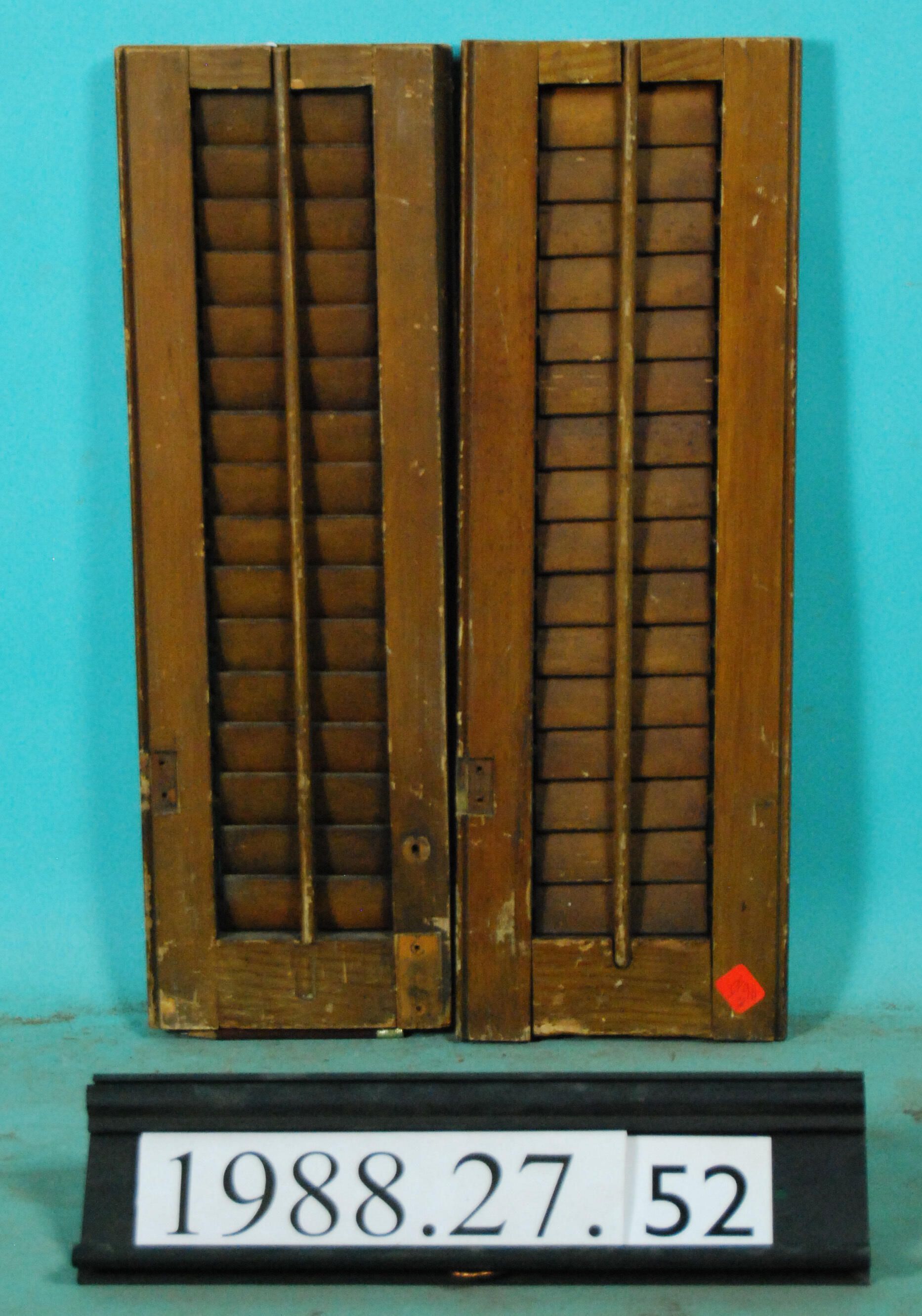 One pair of interior louvered shutter leaves, both are truncated at one end, all hardware is missing Finish: Varnished Material: Wood